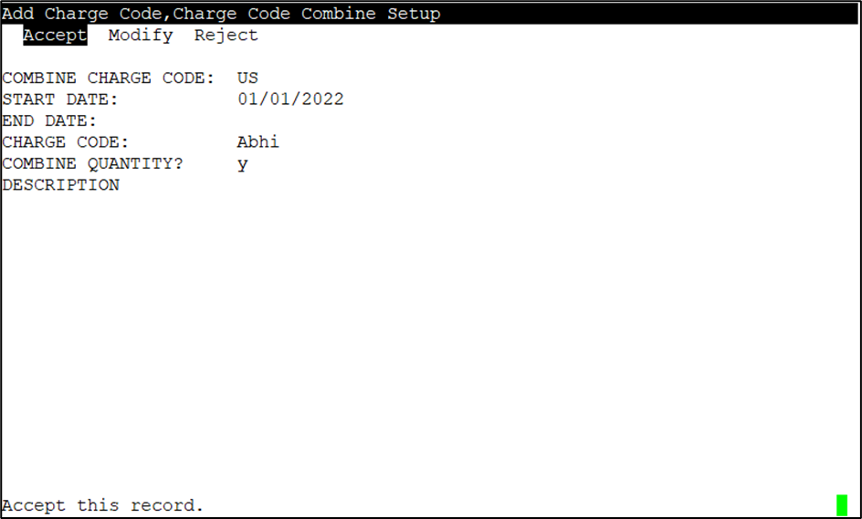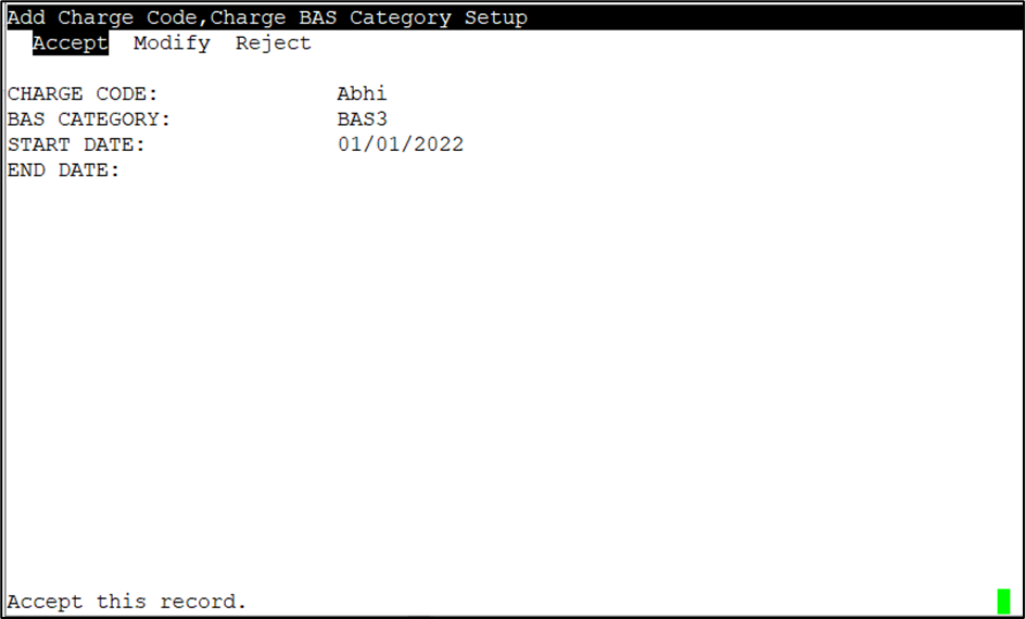 7. Select Accept to enter the charge code and all associated specifics into the database.