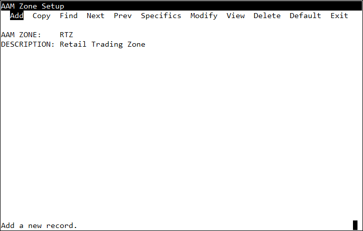 <table><thead><tr><th width="155.33333333333331">Field</th><th width="108">Type</th><th>What to enter</th></tr></thead><tbody><tr><td>AAM ZONE</td><td>open (6)</td><td>Enter an ID for the AAM zone, such as “PMA”.</td></tr><tr><td>DESCRIPTION</td><td>open (30)</td><td>Enter the description for this AAM zone, such as “Primary Market Area”.</td></tr></tbody></table>