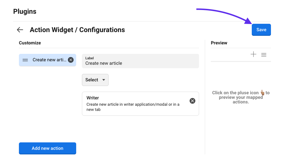 In the dropdown select the action "Create new article in Writer application/modal or in a new tab".