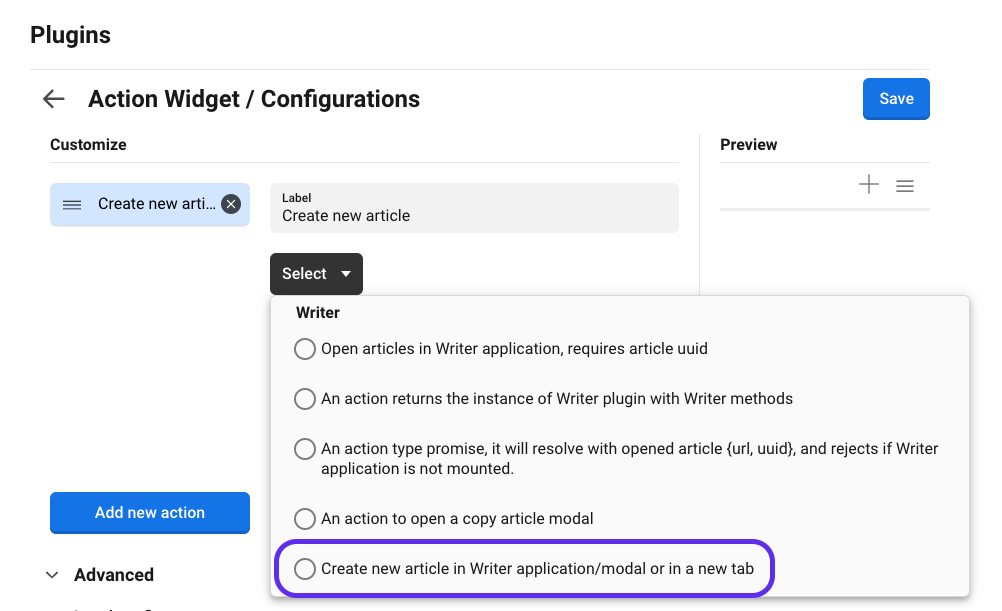 In the dropdown select the action "Create new article in Writer application/modal or in a new tab".