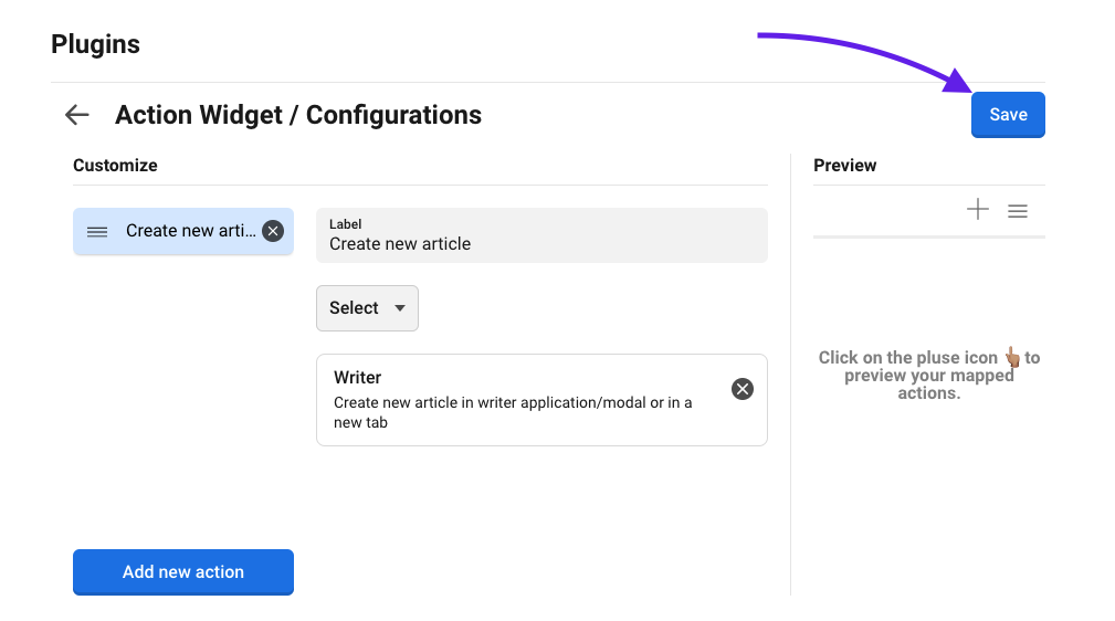 > In the dropdown select the action **"Create new article in Writer application/modal or in a new tab"**.