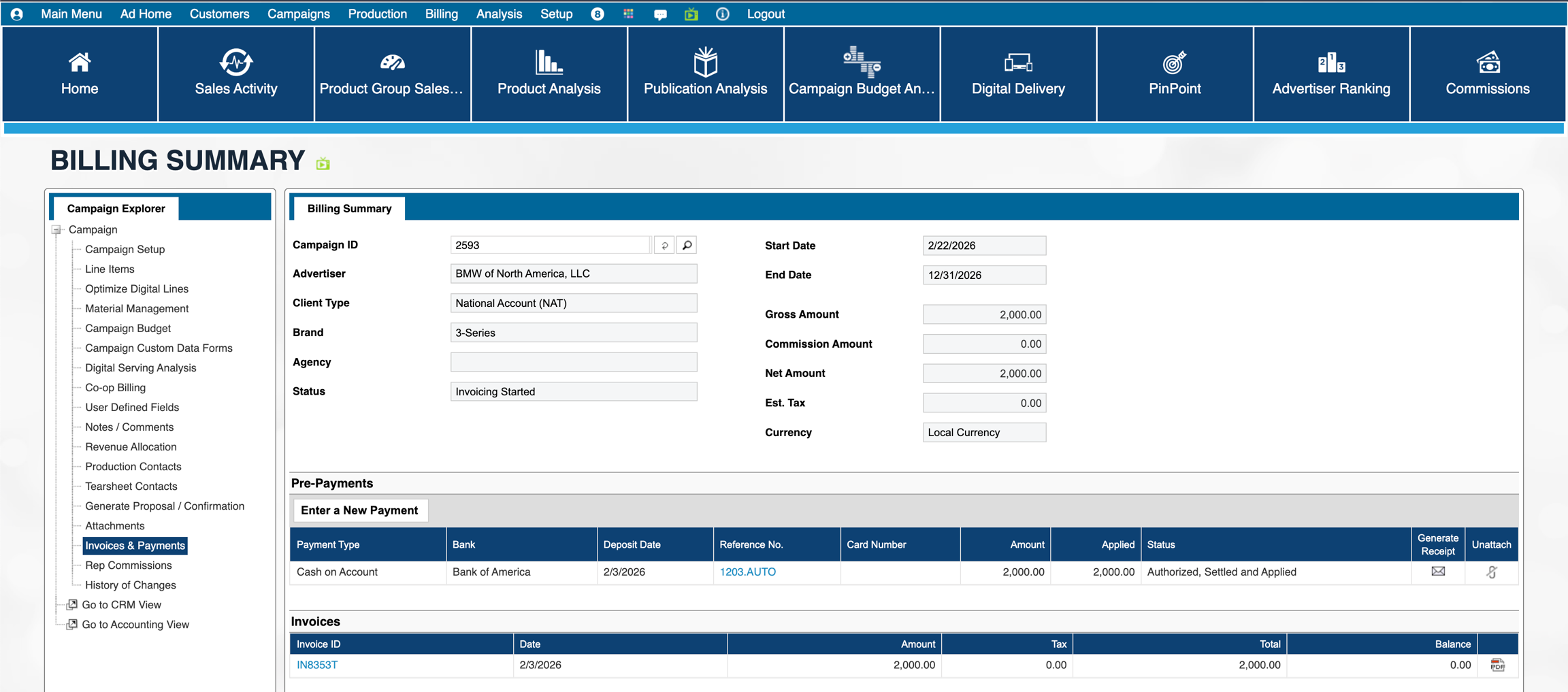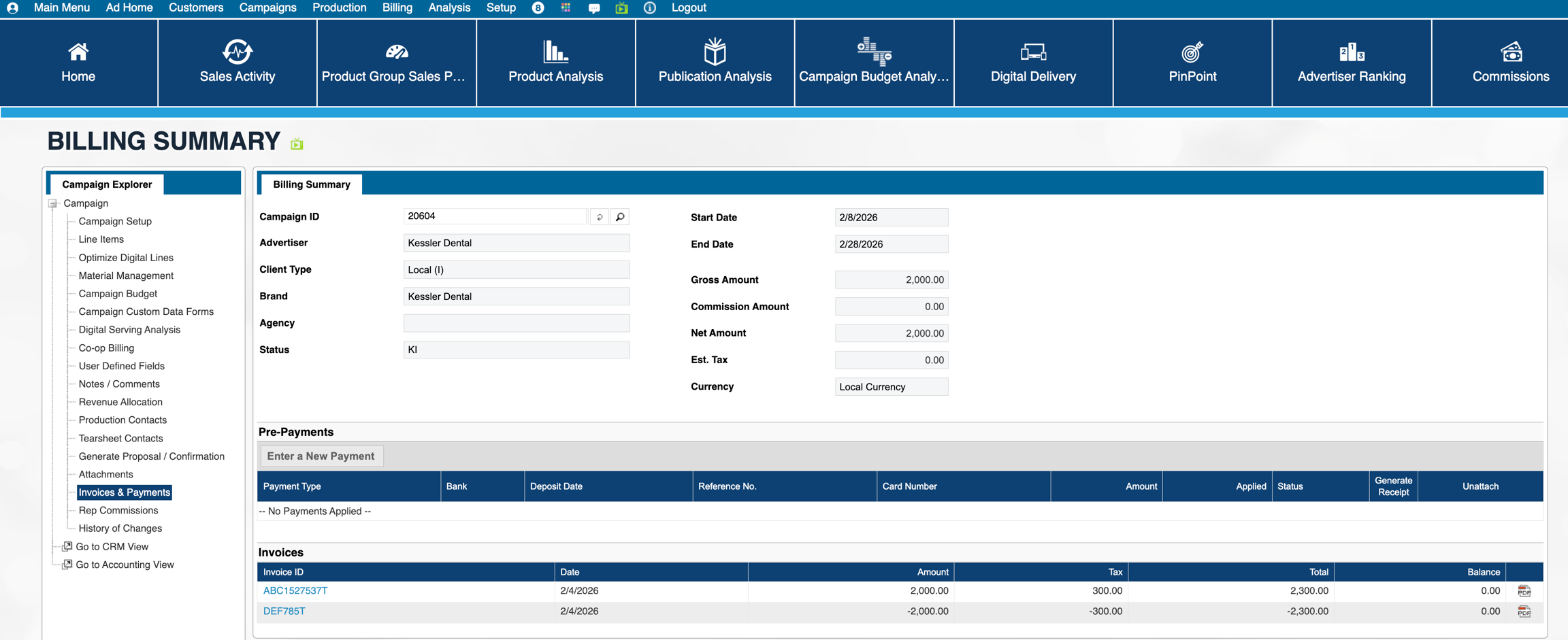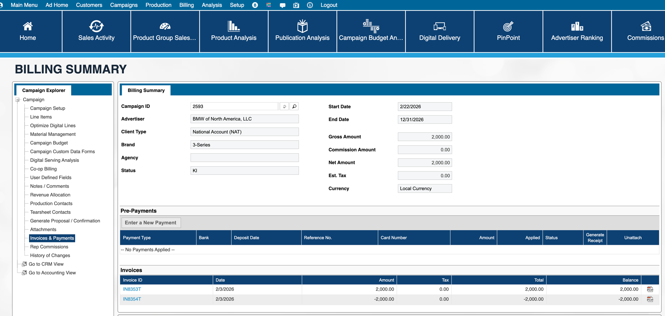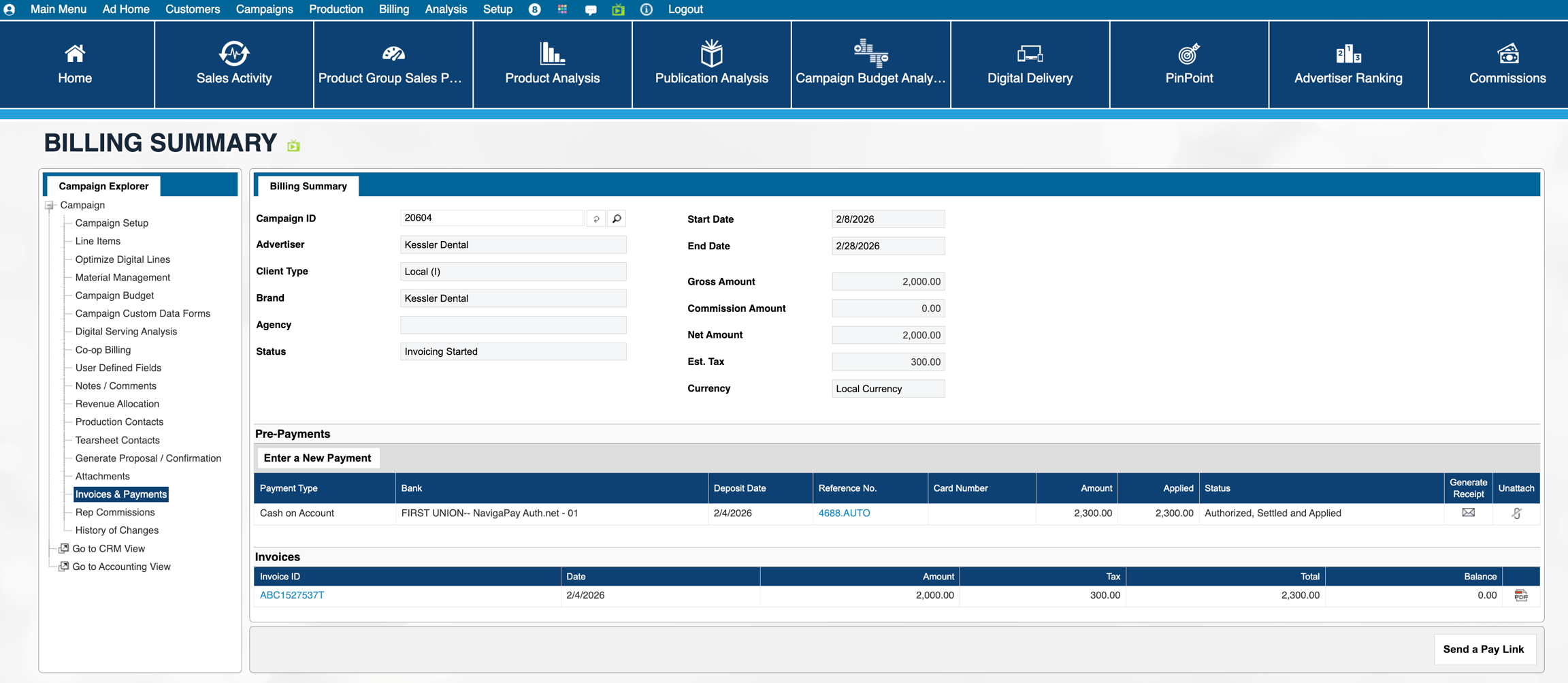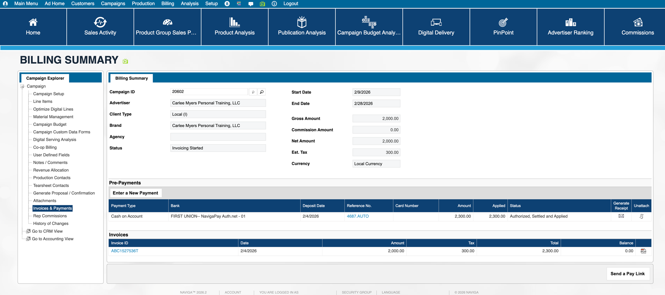 Please note - the reversePayment parameter is only exposed in Naviga Ad v2026.1 and later. Prior to 26.1, Naviga forced that to be true, which meant that unapplyPaidInvoices was disregarded and behaved as if it was also true. Please see Example 1 below for Naviga Ad behavior for this. Examples 2 and 3 only become available in 2026.1