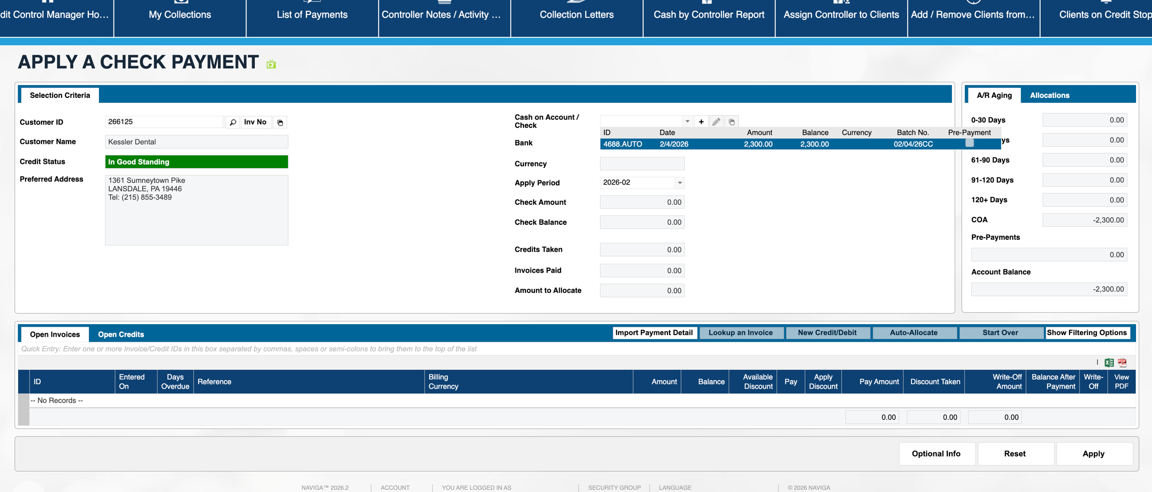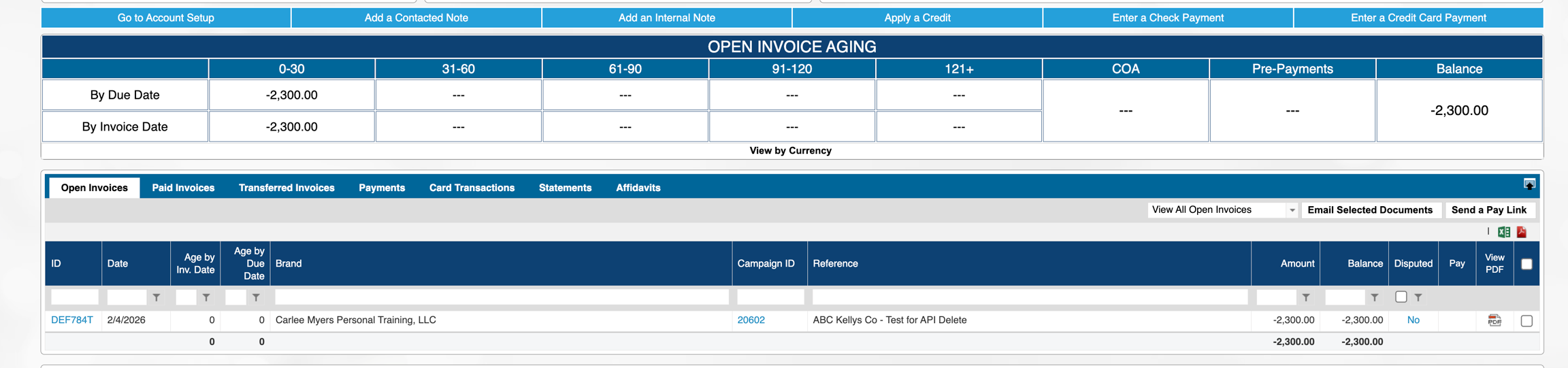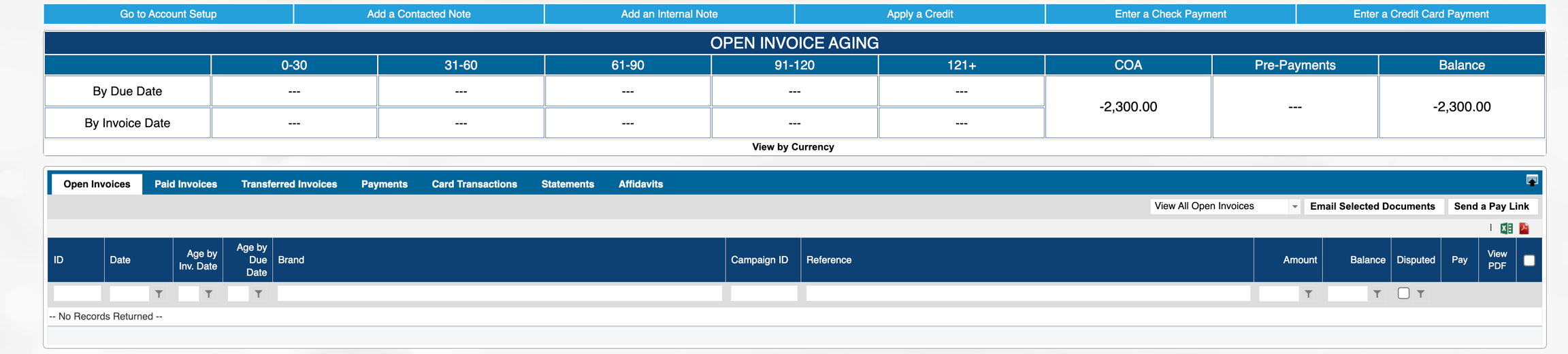 Looking at the customer account, there is nothing on the open invoices tab: