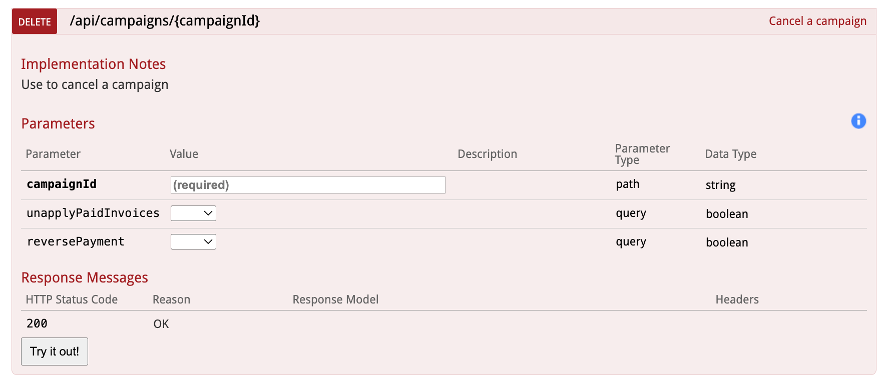 The delete campaign has just three parameters - the Campaign ID and true/false parameters for unapplyPaidInvoices and reversePayment. Only the Campaign ID is required.