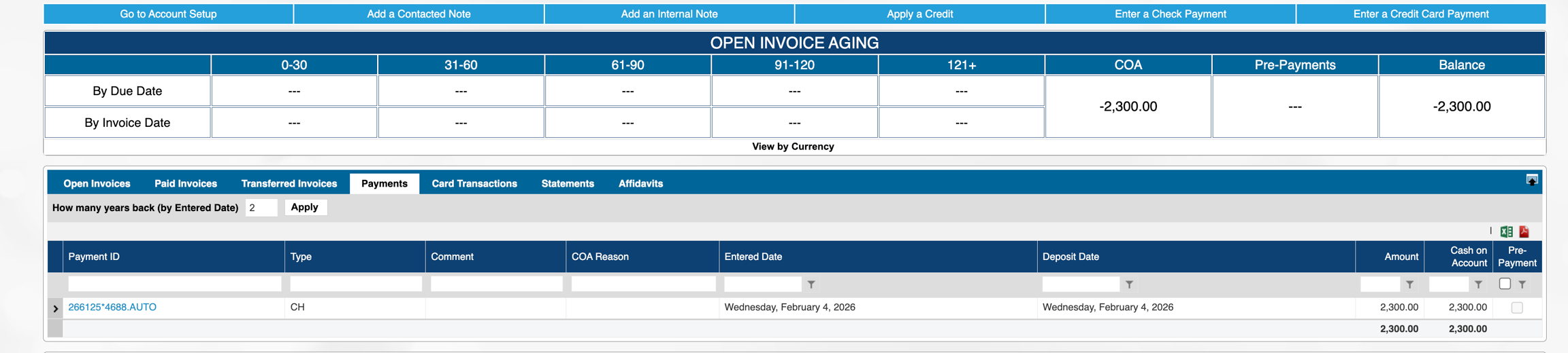 Looking at the customer account, and their aging, the original invoice remains in the "Paid" tab, and the credit is still outstanding and available for use to apply as a credit on another invoice. This is technically a credit memo and not Cash on Account so it will need to be applied via Cash Receipts in the A/R Module.