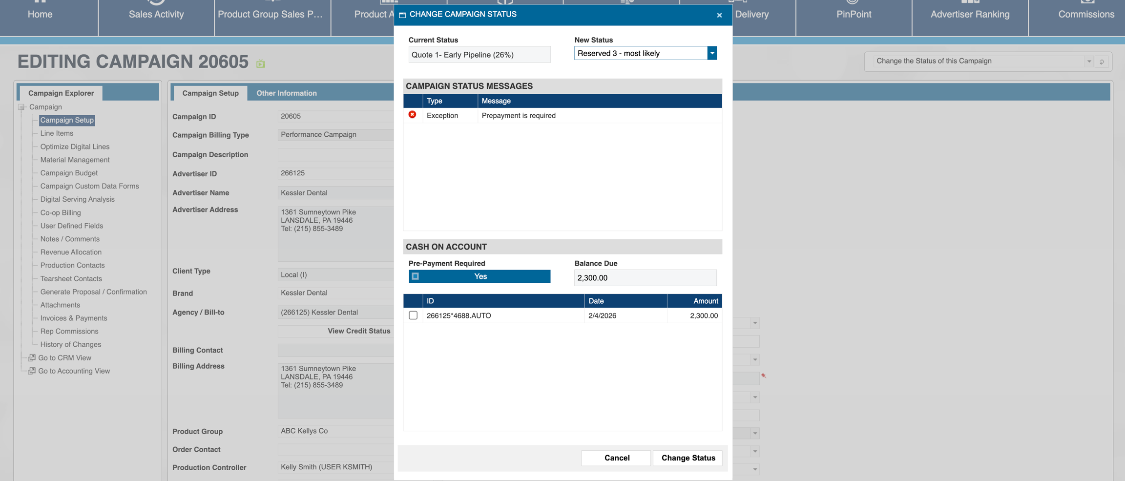If the campaign was already invoiced (but not paid) then the status will become AC (Awaiting Credit) upon cancellation. The credit invoice will get picked up in the next invoice batch and then the status will update to KI (Killed). In this case the order line(s) cannot be fully removed since it is linked to an invoice (and a credit) record, but the amount will be zero'd out (due to the invoice and the credit netting out to zero).