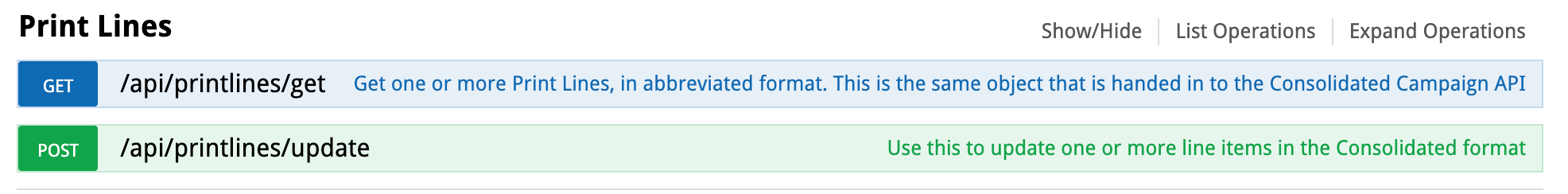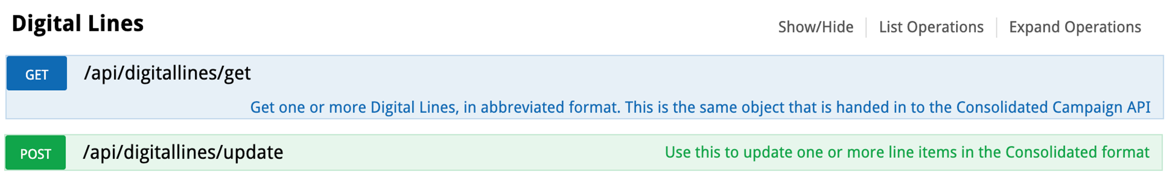 To Edit a campaign line, in Swagger we have separated this into two distinct sections - Digital Lines and Print lines are quite different so they both have their own Endpoints. In each, there will be a GET and a POST.