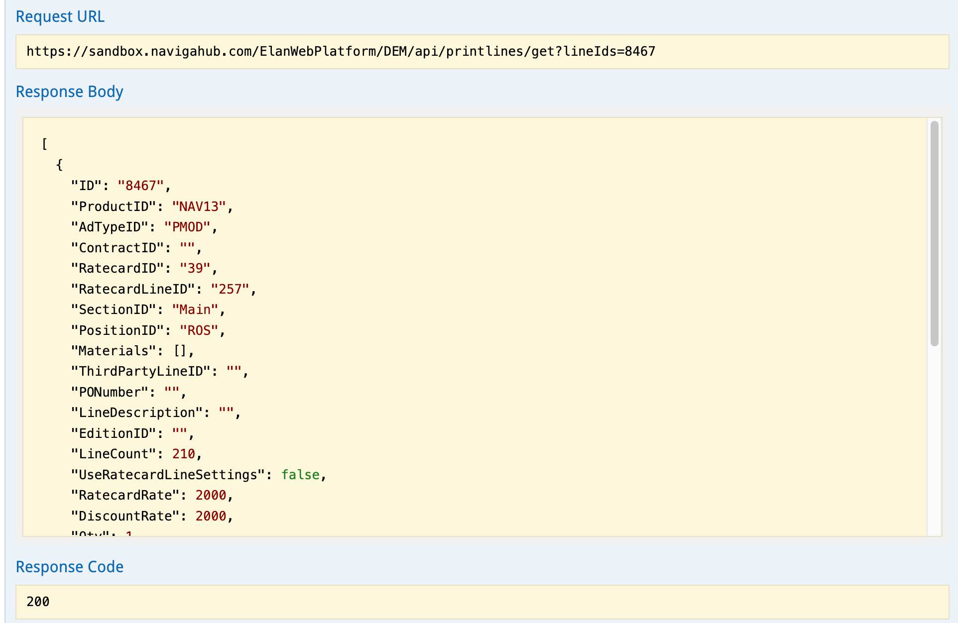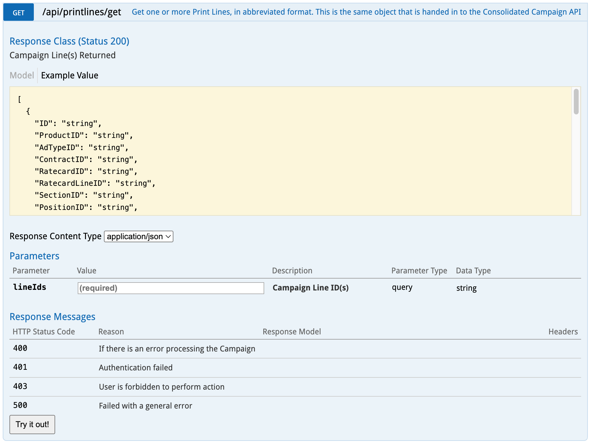 In Swagger, expand the GET /api/printlines/get