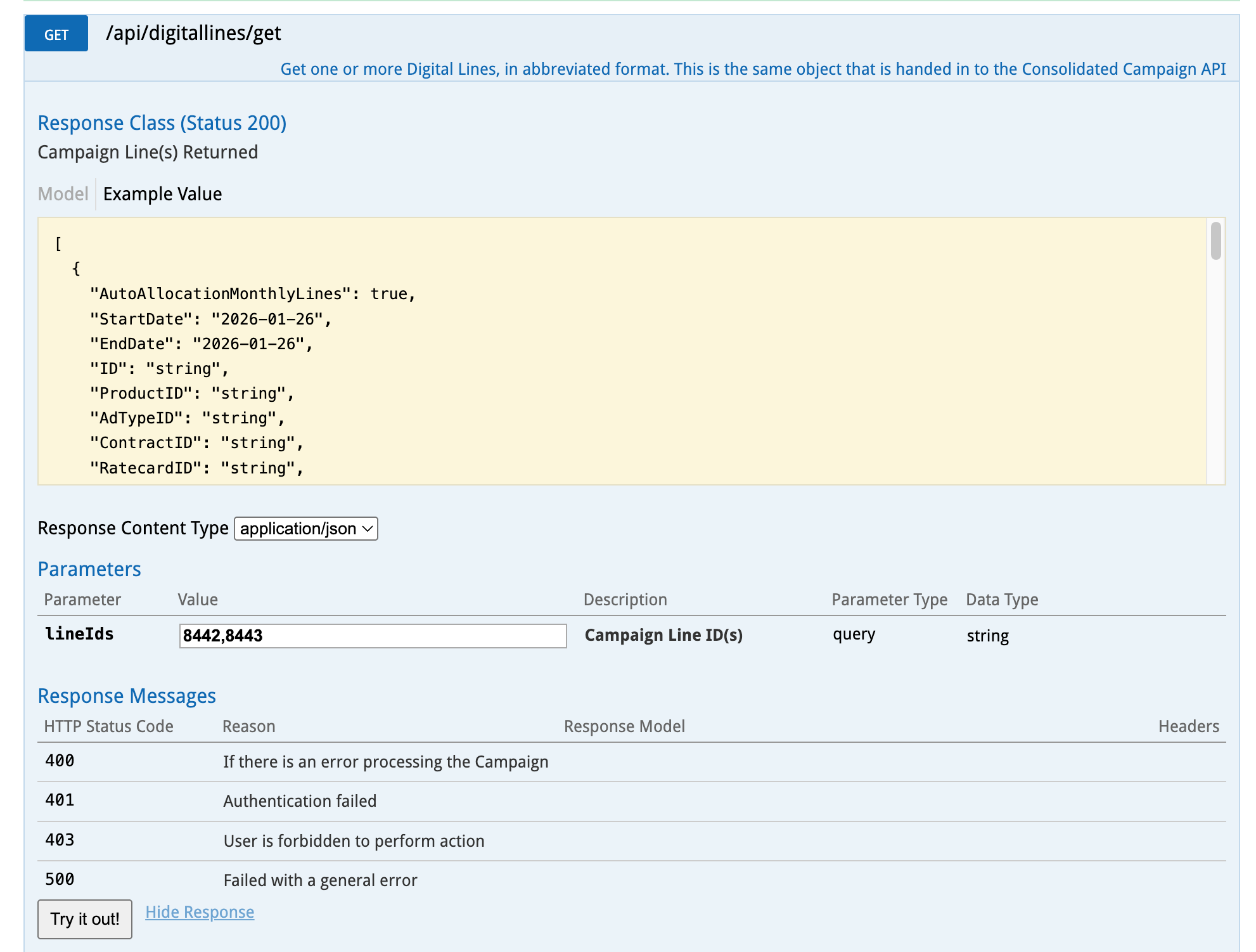 In Swagger, expand the GET /api/digitallines/get
