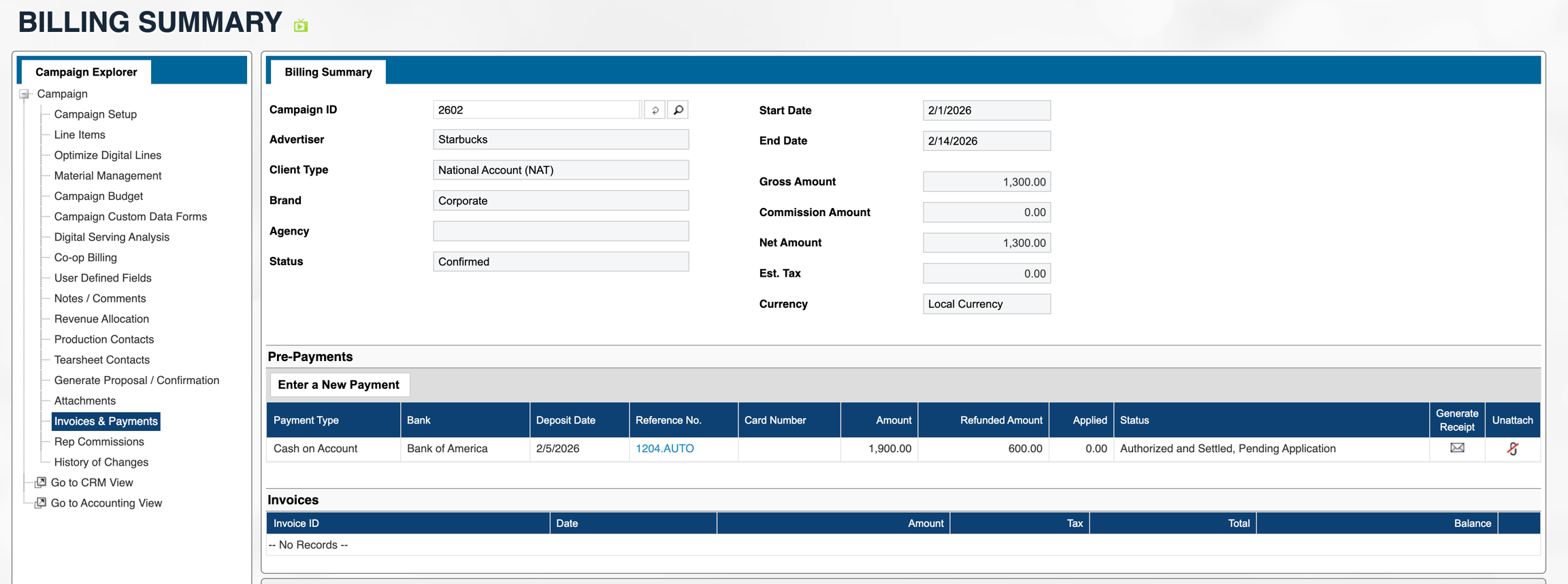 This will then display as shown below - with a $1300 balance remaining on the original payment which will cover the campaign amount and will apply to the invoice once it is billed