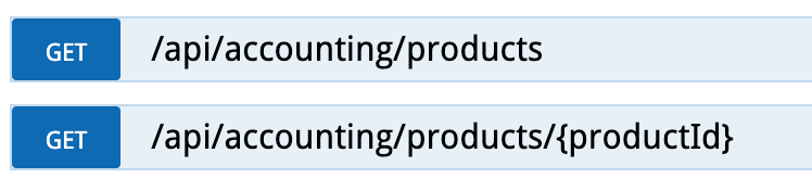 Products - these are for accounting products which get used in Misc Invoicing. This one isn't frequently used, but there are two simple GET options here. The first will fetch all products and their details, and the second will provide same details, but for one specific product ID.