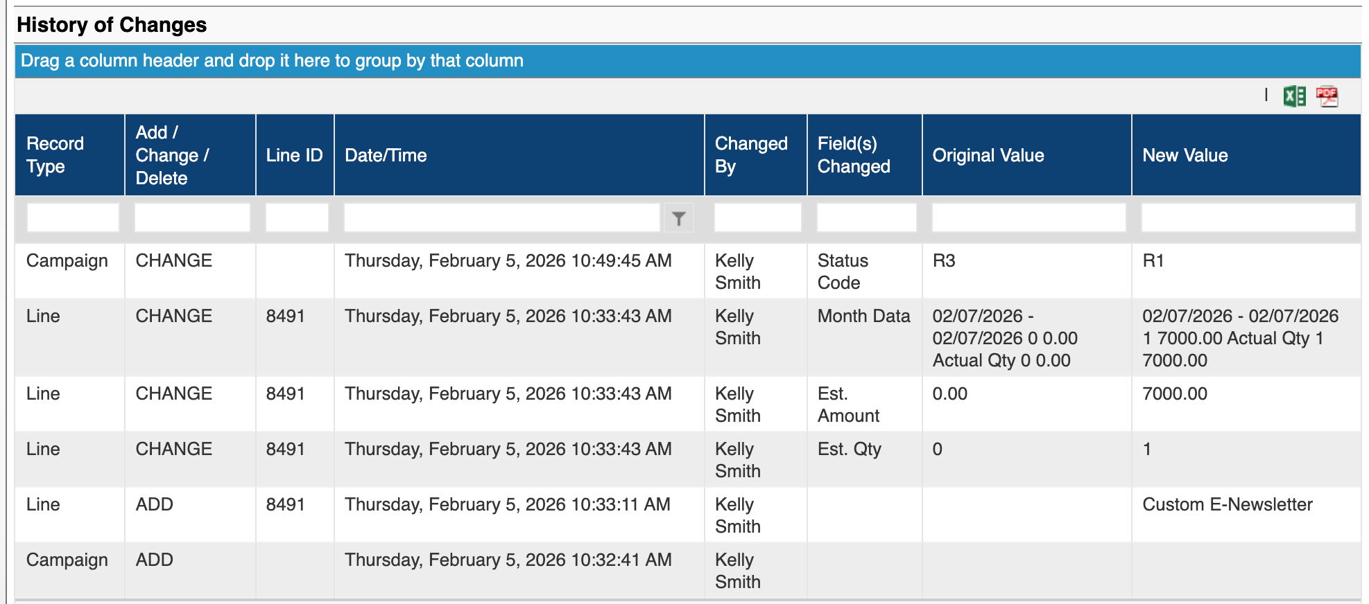 Note that the campaign line was created at 10:33 and at 10:49, the status was changed to R1.