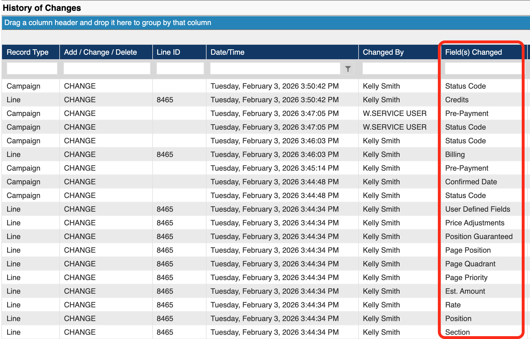 This is looking at the History of Changes screen on a campaign, and specifically the Field(s) Changed Column. The parameters to fill in here would be an exact match to what is in that column (case sensitive). And it works in conjunction with the UpdatedSinceDateTime parameter above. Please see below for an example.