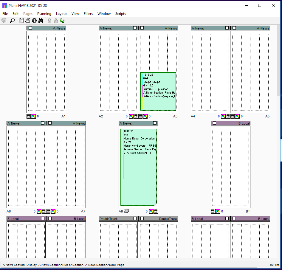 Naviga Plan provides paper planners and editors with a graphic representation of each page set in the plan, so they can easily see where ads have been placed on the pages. If using this in conjunction with NCS Content, you will also be able to see a read-only view of editorial stories on the pages.