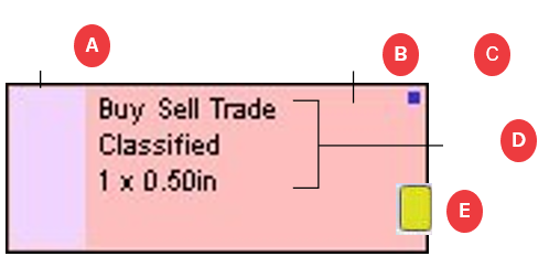 Solid thin Color bar representing the Section of the display ad (the gray bar along the left edge in picture above). Optionally, the ad layout may be filled with the classification color, in which case the classification bar will not be displayed since the entire ad will be colored by class/section. The colors are assigned by Plan (not user configurable) to enable quick distinction of classification groups.