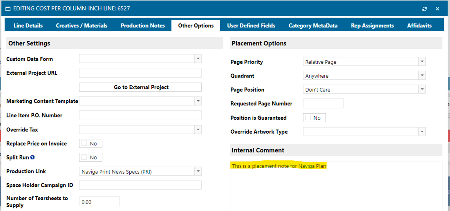 The placement notes. In Naviga Ad, this is the “Internal Comment” field from the “Other options” tab in order entry.