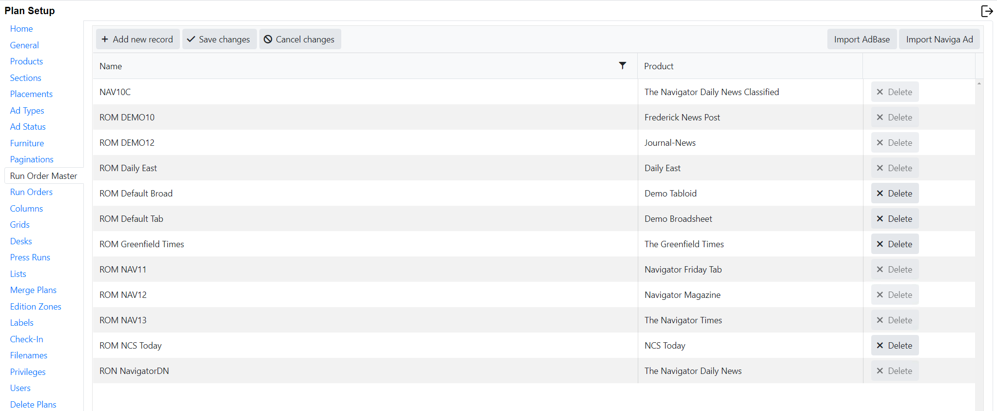 b. From Adbase, this will import in for you, all your placements, positions, level 3 and level 4 items and will create sections in Naviga Plan Setup for them. It will also link these sections to the Run orders for this Run order Master