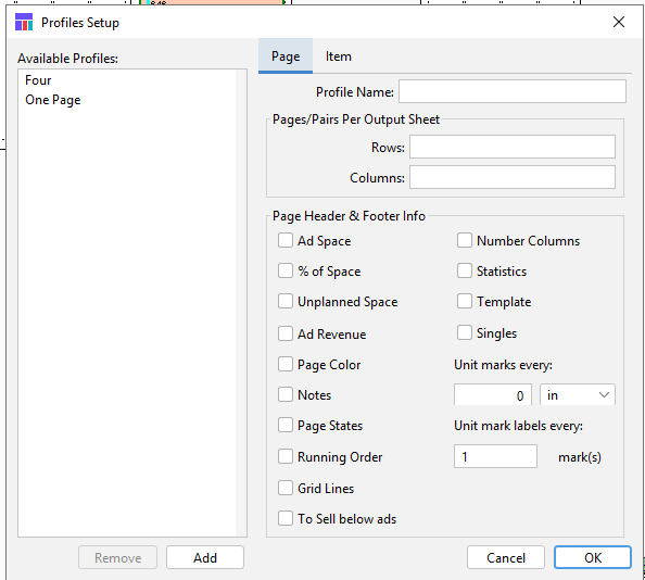 Click the Edit Profiles button. The Profiles Setup dialog box opens with the Page panel selected.