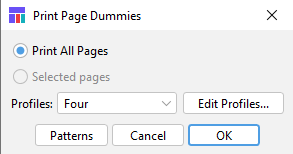You can add new print profiles or edit existing profiles for printing dummies. In these profiles, you can designate how many dummy pages will appear on each printed page, what information will appear in the footers for each dummy page, and what information appears in the element-types on each dummy page.