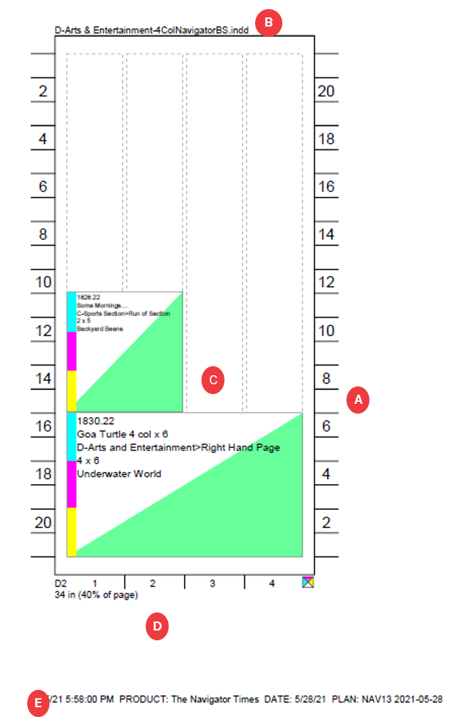 Elements: Items users can place on a page in the Plan, such as ads, fillers, headers, or reserved spaces. You can distinguish between these elements on the printed page by assigning each element type a pattern and, if desired, a color.