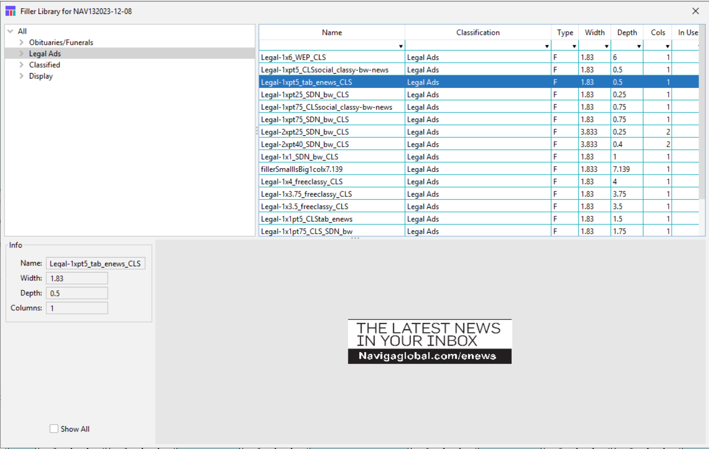 By default, you will see only fillers in this view. Click Show all checkbox at the bottom left to also see banners and headers. Select the category at the top to select which category you wish to see furniture for. The columns can be sorted by double clicking on the header. There is only one sort in here, so clicking on an additional column will sort by that column instead. Note that the very top row in the grid allows for filtering.