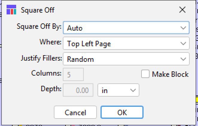 From the Square Off By dropdown, select whether to square off automatically, by columns, or by depth from this popup. Note: If you choose to square off ads automatically, Naviga Plan attempts to square them off as best it can. Extremely long ads may not square off well. If you choose to square off by columns or depth and there aren’t enough ads to do it will, plan will not do it.