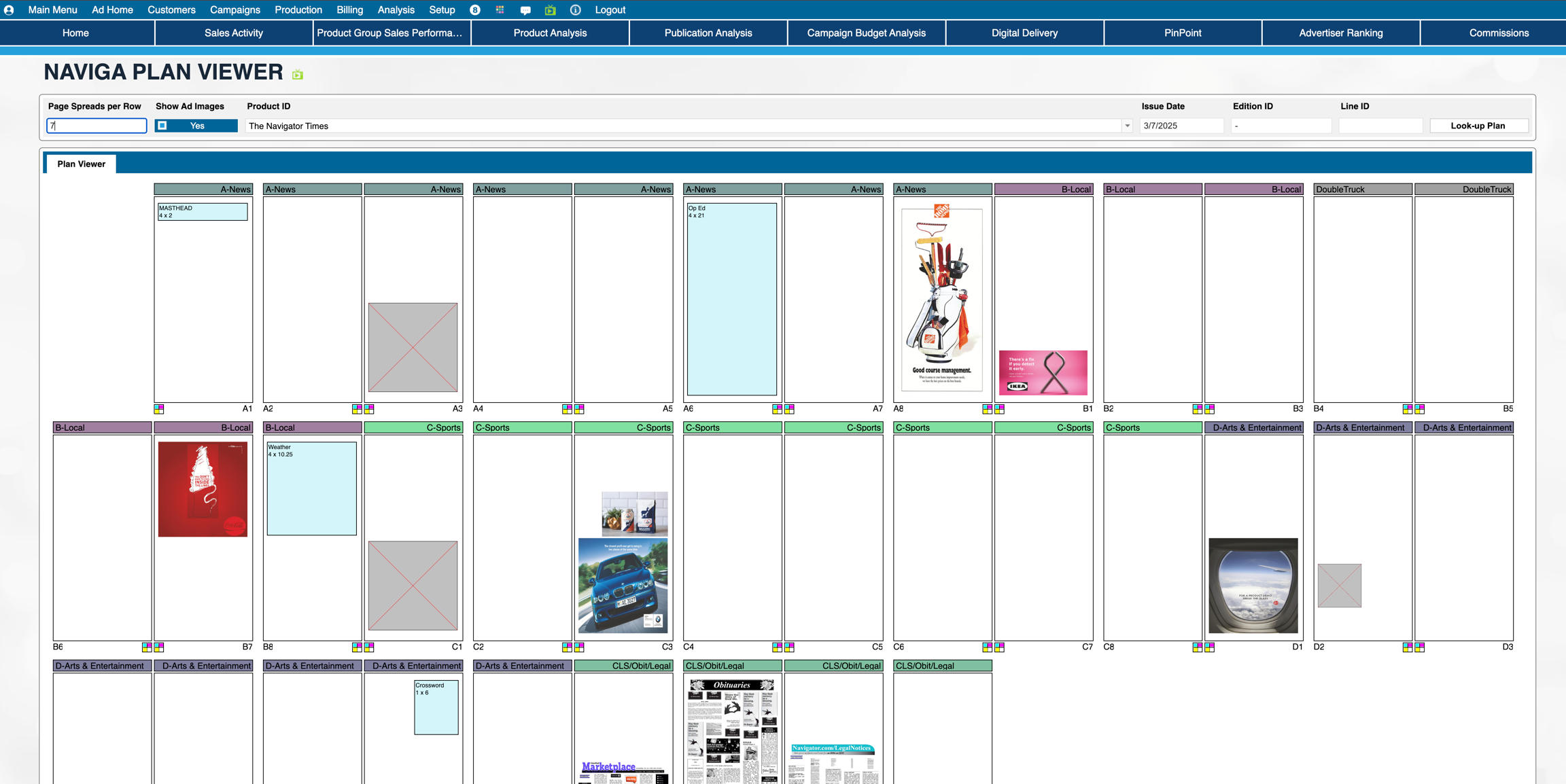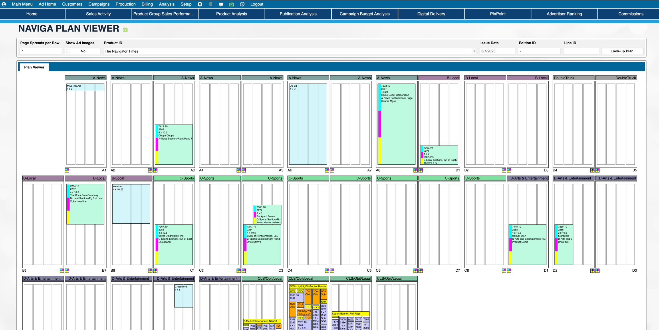 Naviga Implementation or Support resources will install Plan View upon request or Plan View Web if your contract allows for it. In the back end setup, there is a config file which controls the fields that are able to be seen and the order in which they are presented. These are currently the options available: Ad Name (This is the Naviga Ad Order ID (ie. 12345.1), Campaign ID, Campaign Description, Ad Size, Customer Name, Customer Brand, Sales Rep Name, Classification, Production Notes, Placement Notes, Material ID, and Copyline.