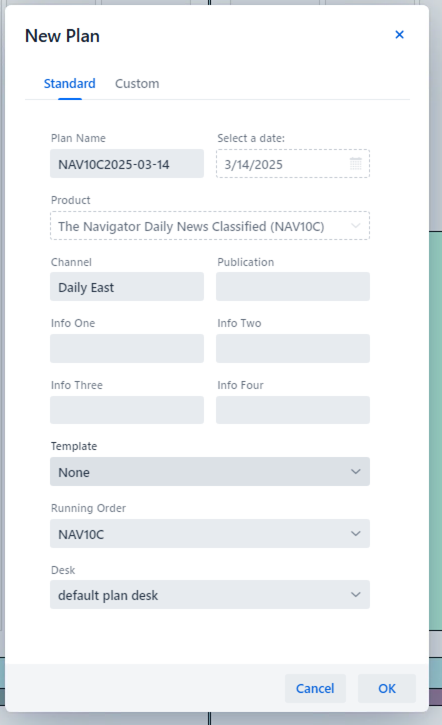 If this is the first time opening the plan, the New Plan dialog box opens so that a user can select the template to use for this issue date.