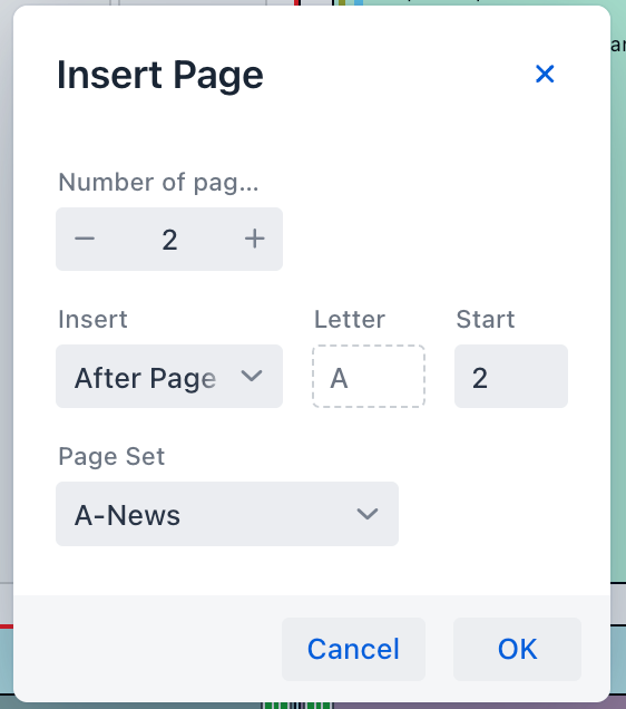 Press ⌥+Shift-N (Mac OS), Alt-Shift-N (Windows) The Insert Page dialog box opens.