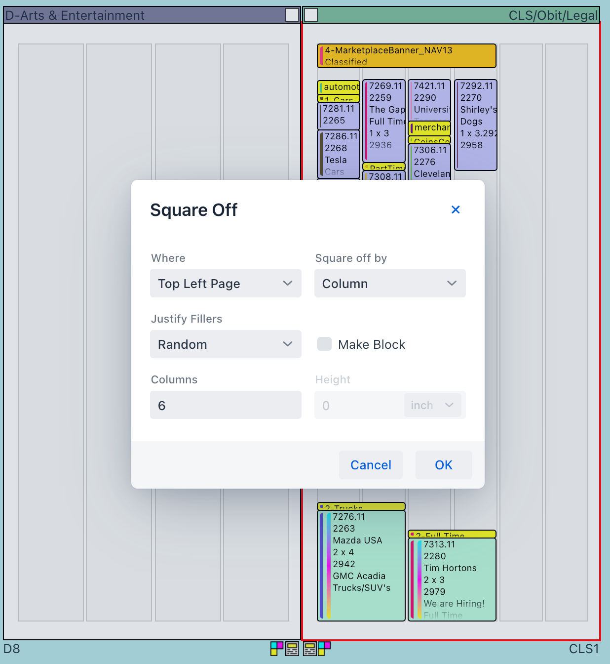 From the Square Off By dropdown, select whether to square off automatically, by columns, or by depth from this popup. Note: If you choose to square off ads automatically, Naviga Plan attempts to square them off as best it can. Extremely long ads may not square off well. If you choose to square off by columns or depth and there aren’t enough ads to do it will, plan will not do it.