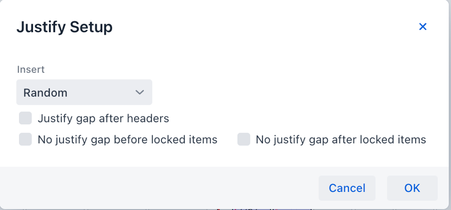 To designate the placement of fillers when you choose Up and Down filler, choose Justify Options. The Justify Setup dialog box opens: