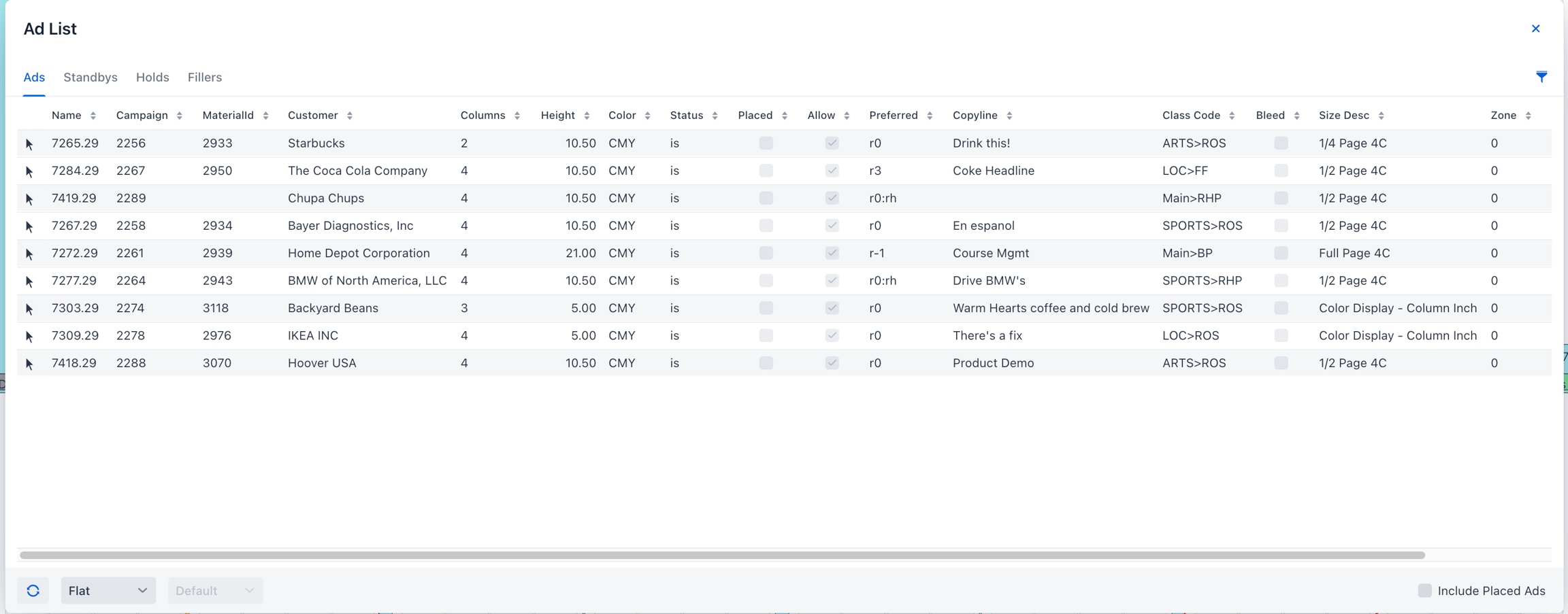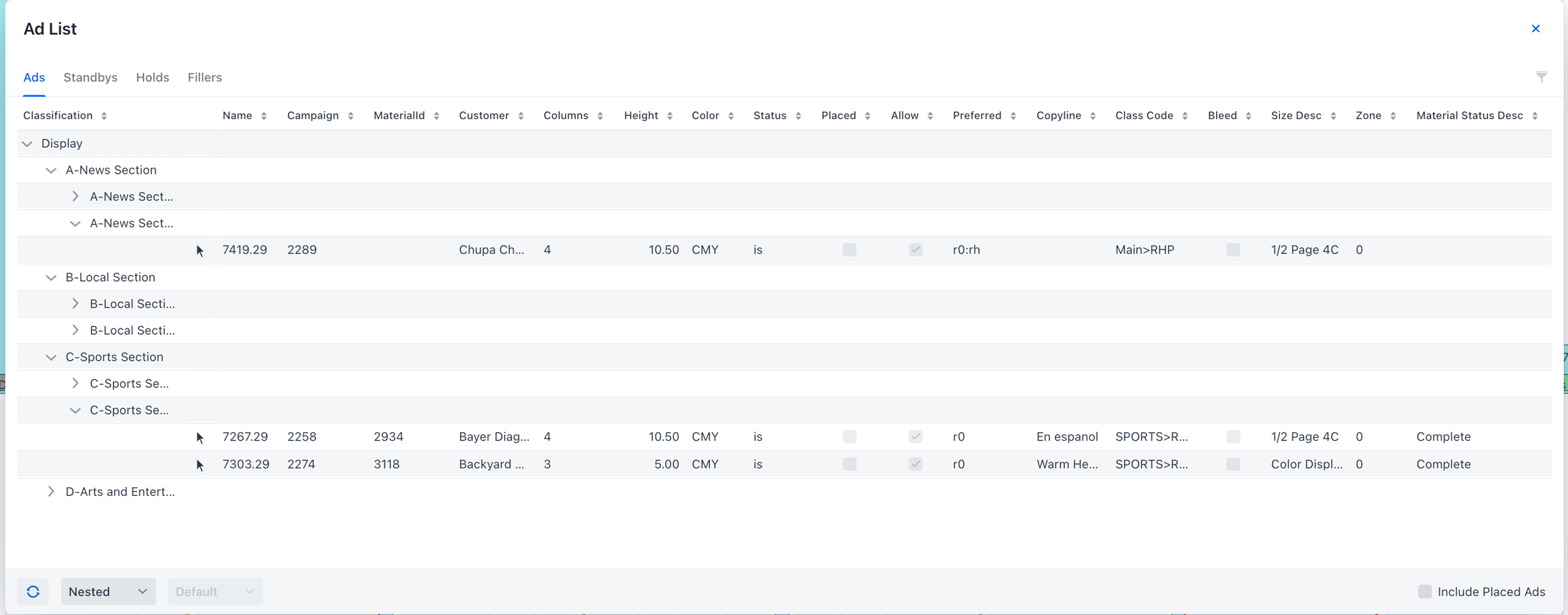 In the Ads list, look for ads that have their Placed boxes unchecked, or uncheck the Show Placed Ads check box to list only ads that have not been placed. Users can choose to view ads as a list (flat), or as nested classifications. Nested looks like this:
