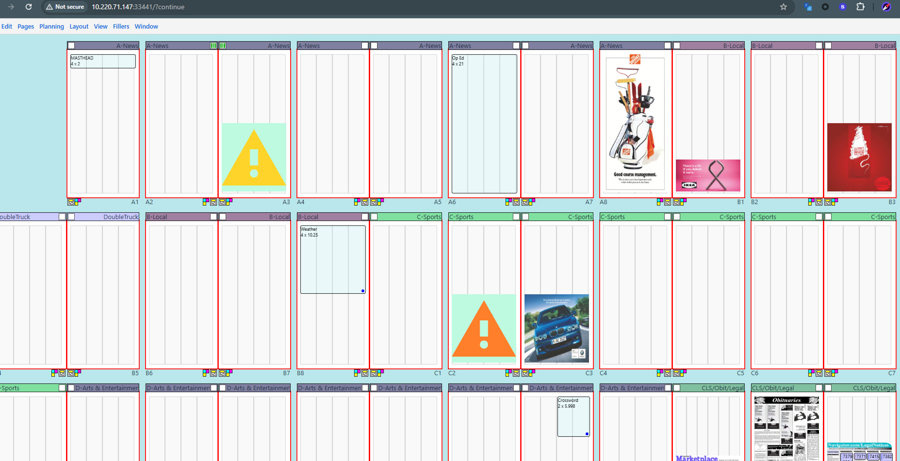 You can preview an ad, a page or multiple pages in the Plan. The Preview Page function changes your view of objects on the page from outlines to lo-res previews of ads, and, if using NCS Content, also stories.