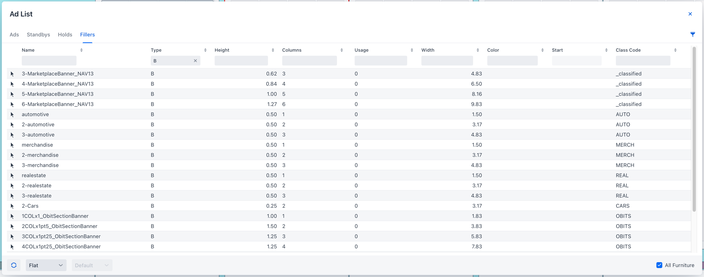 The Fillers panel lists fillers for all advertising sections. If desired, the panel also shows all banners and headers by clicking the "All Furniture" checkbox in the lower right corner.