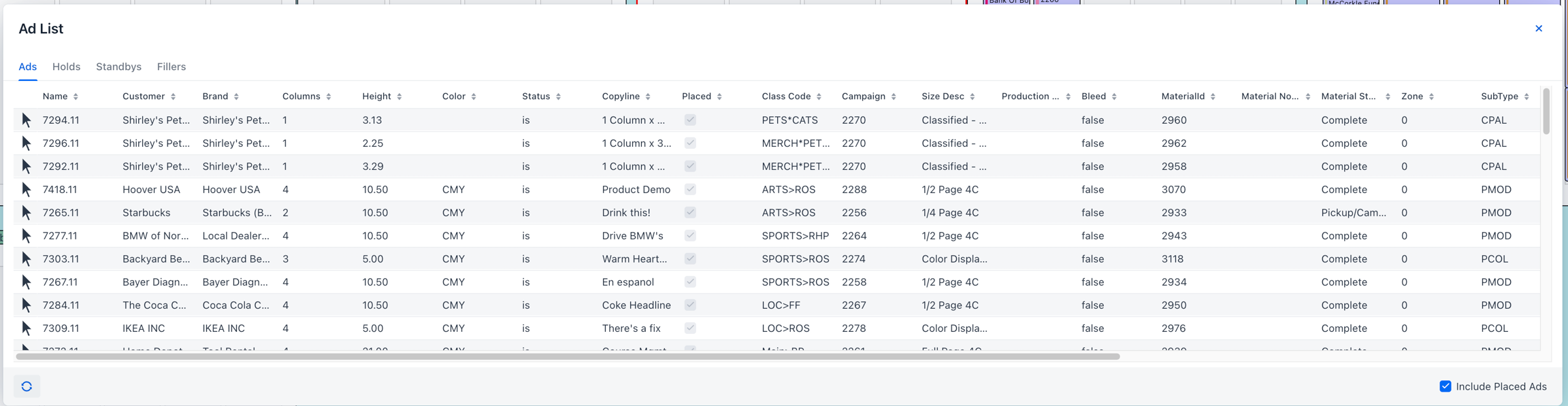 If you want the list to include ads that have been placed on the plan, in the Ad List dialog box, check the Include Placed Ads check box. Important: When the Include Placed Ads check box is not checked: