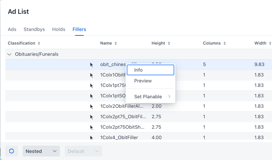 Fillers, banners, and headers are set up and created in Naviga Plan Setup and organized in the Fillers panel. See Naviga Plan Setup for information on setting up Fillers, banners, and headers.