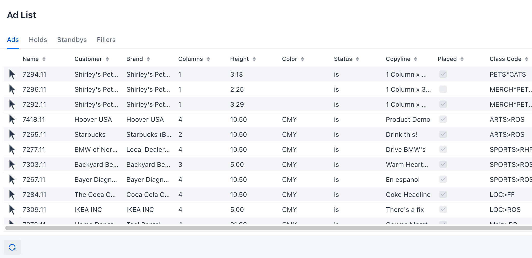 The Ads list does not include classifications for which all ads have been placed.