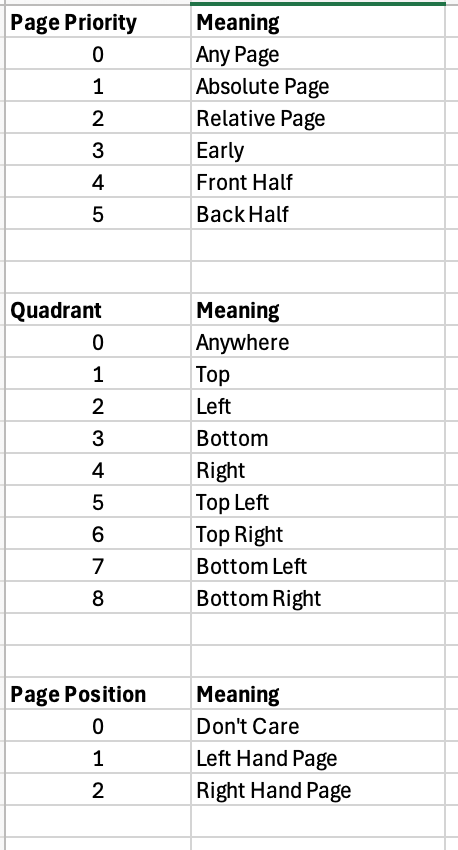 Displays info on the preferred position of the ad. This is a code that is set based on the position settings of the ad. Here are the code meanings: