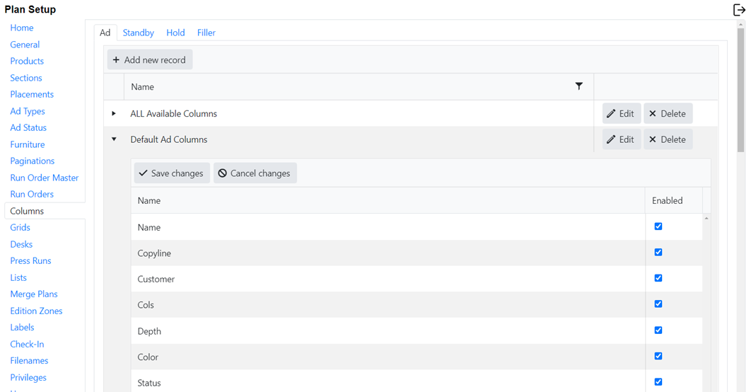 The columns screen will allow you to customize which columns you would like to see in the Plan worklist. There is a Default Ad Columns set up already, but you may add additional column settings as desired. Inside the worklist, the user can choose which set of columns they would like to see. Plan will remember their chosen view.