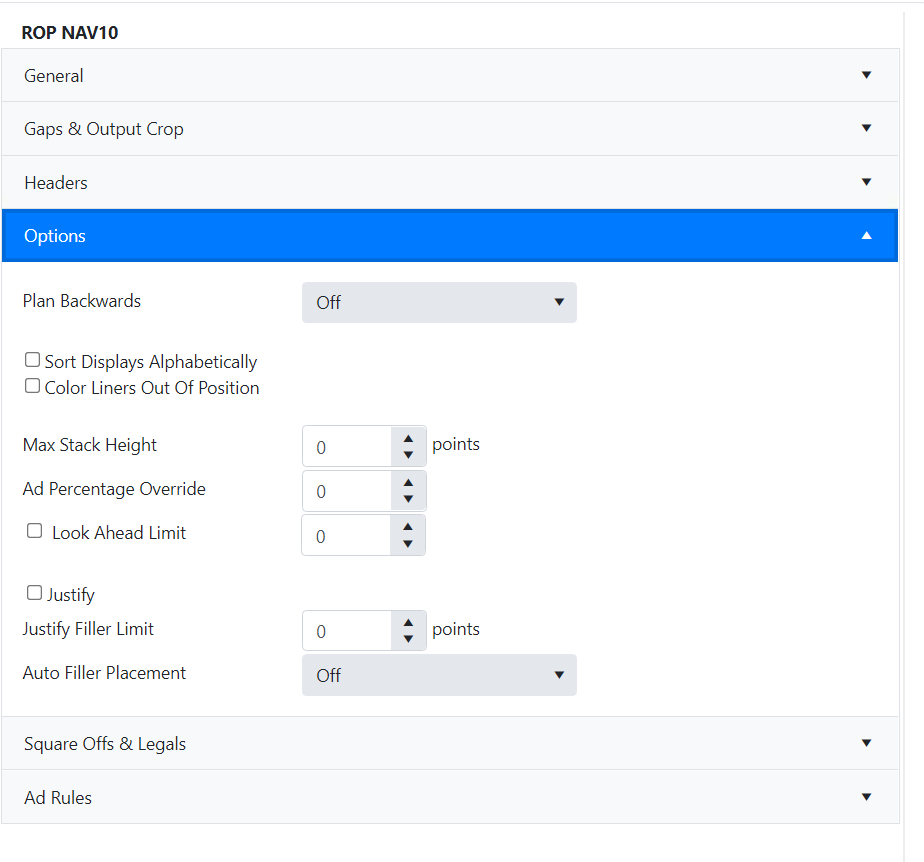 The first three choices are related to automatically squaring off a page. Choices under Start Position are Top Right, Top Left, Bottom Right, Bottom Left, or Disabled. When anything other than “disabled” is selected here, the ads will automatically be squared off on the page when the ads are placed. The user in Plan can change the position in Naviga Plan, but he cannot turn off Square-offs completely if they are set here in the defaults. For the most flexibility to the users, set this to Disabled here and let them decide what to do in Plan. If you always want to square off the ads, then it saves some time to set it here. Depth and Columns will be set to indicate if you always want the square-off to be a certain depth and/or number of columns. For example, if I always want the square-off to be over 6 columns and to use whatever depth is needed based on ad volume, then set this to 6 columns and leave depth at 0. Columns are in number of columns format, depth is in Points.