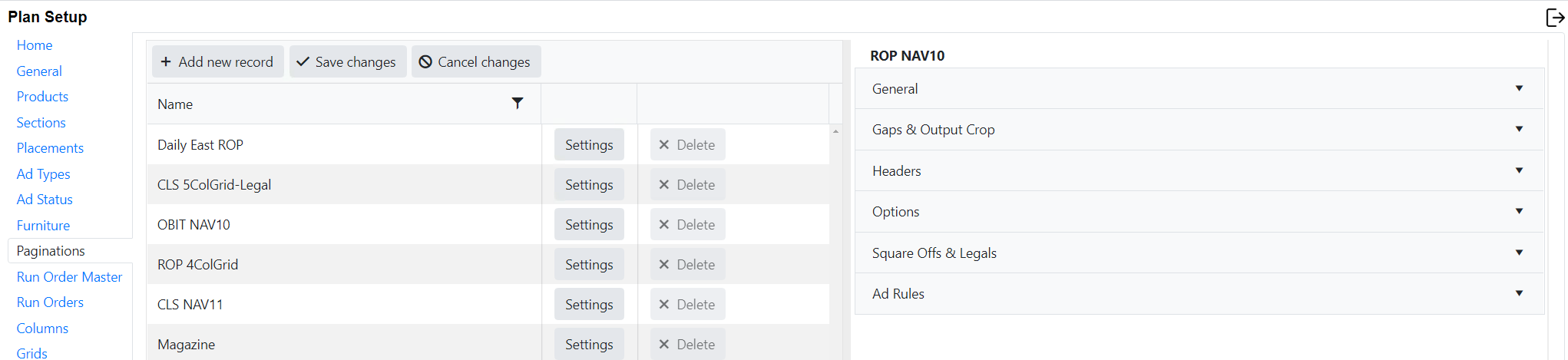 Paginations tell Plan what the rules are surrounding your ads. It also tells Integration what Grid size is used for any given section when the order comes in from order entry. Paginations can be shared among different Products if they have the same grid sizes and follow the same rules for flowing and stacking ads.
