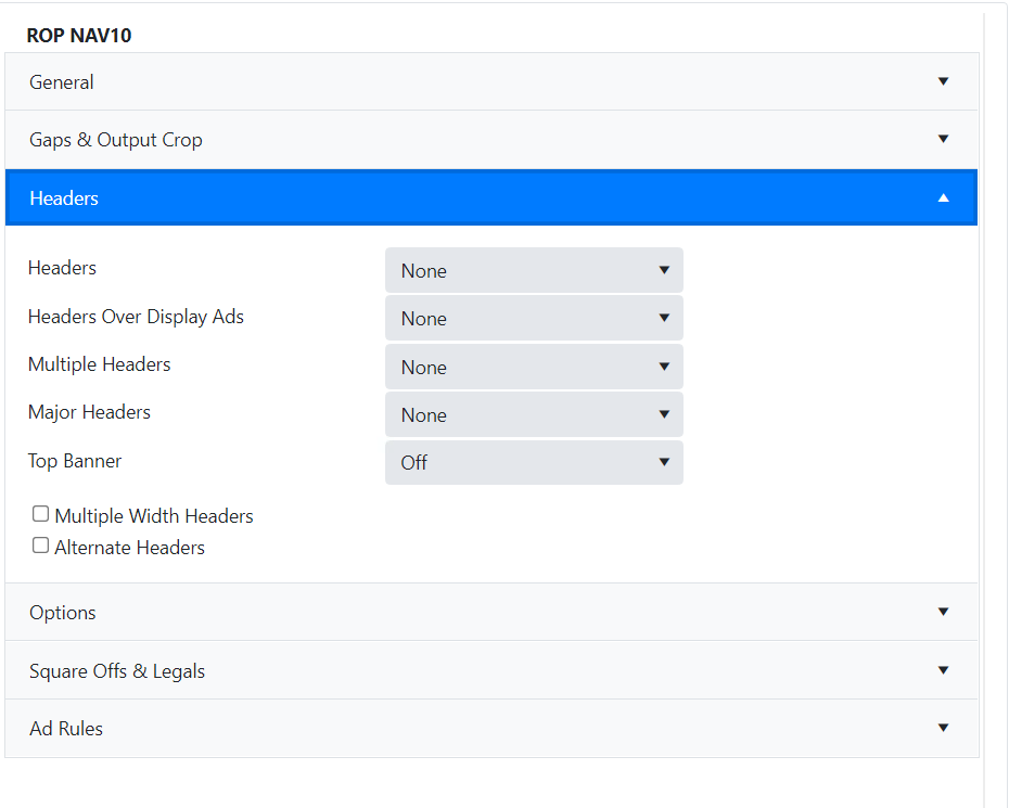 Headers are the category headers over each classified ad category. The rules set in here will influence how the headers behave when flowing classified ads.