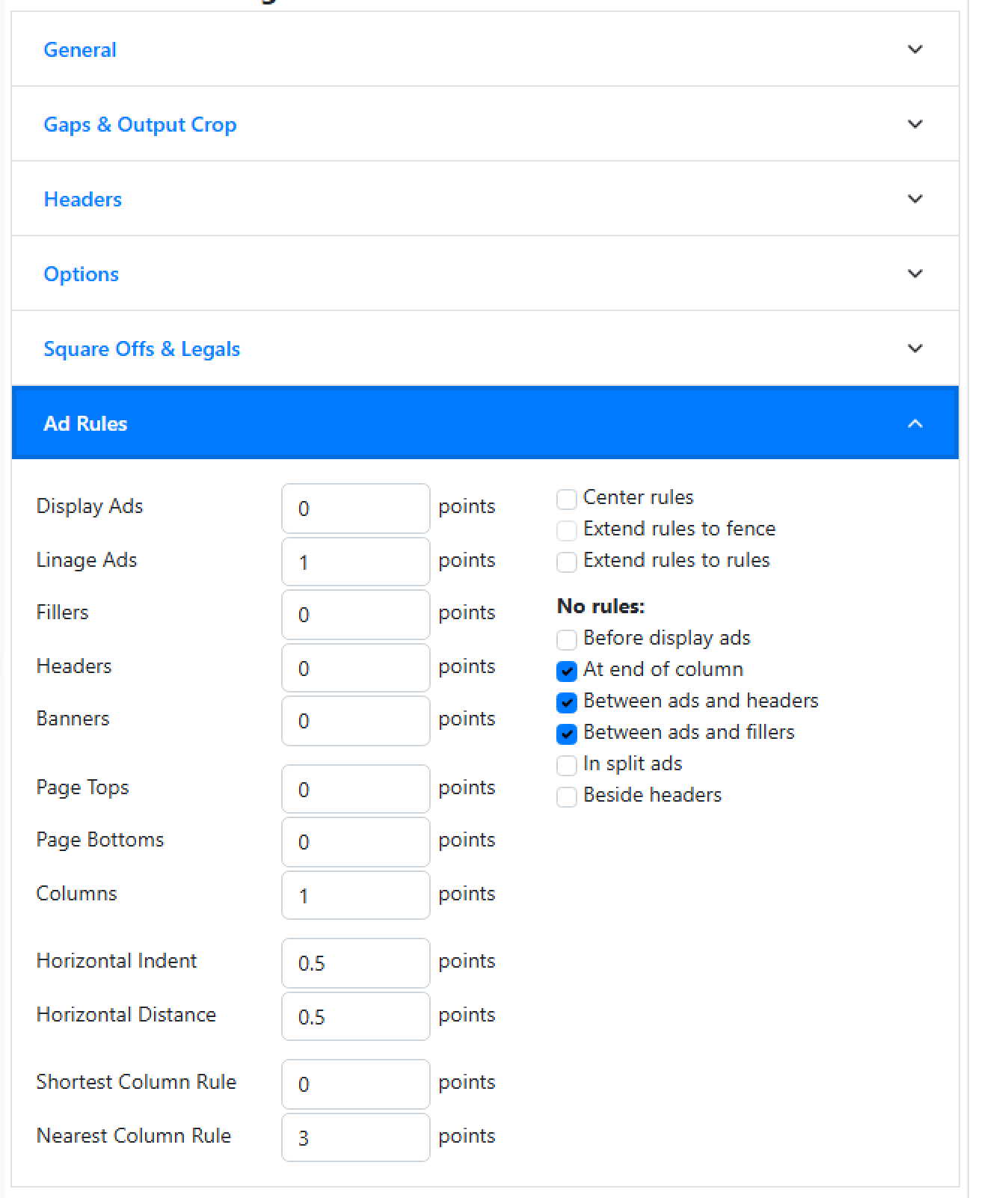 Ad rules are lines between ads, or between ads and furniture. The settings here are in points indicating the thickness of the rule. If you do not wish to have a rule on any of these settings, leave the thickness at 0.00 points.