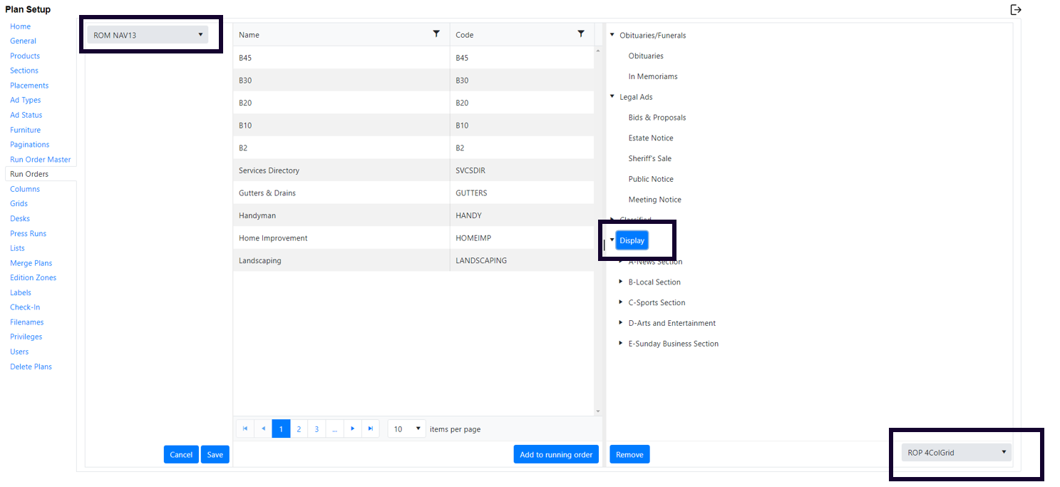 Normally, you will not need to do much manual configuration in here. The “Import” function on the Run order master will set all the sections for the product under the Display heading and it will import all the Classified Categories into the Classified heading. The important part that you will need to do manually here is to add a pagination rule to the Run Order. This can be done at the top level of Display or Classified, or it can be done further down if a particular section behaves differently than the others.
