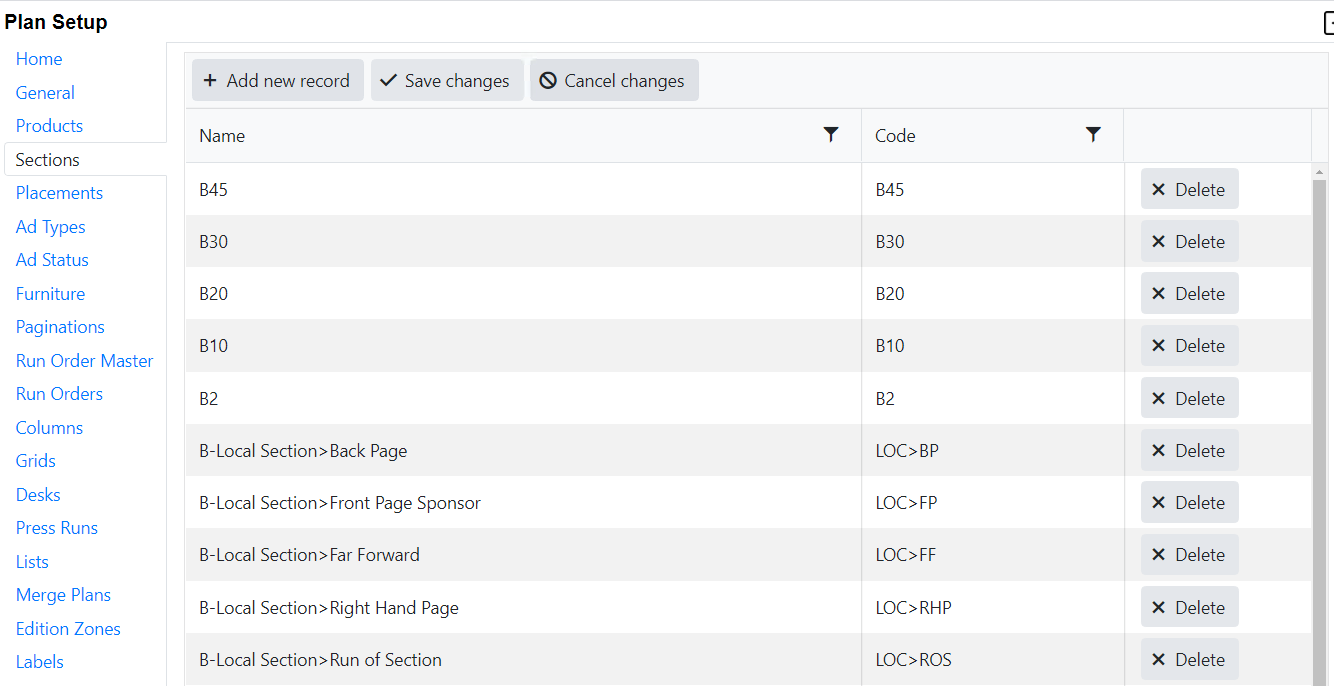 Under normal circumstances, Sections are not manually setup. They are imported into Naviga Plan when the Run Order Master is set up. (See Run Order Master).