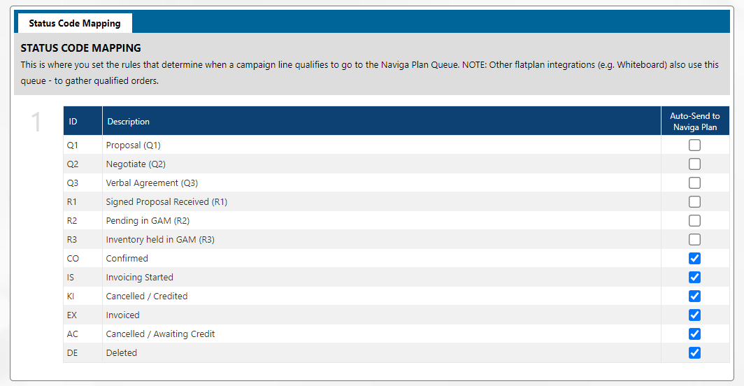 Ads coming from Naviga Ad will have a two-character code indicating the campaign status. The statuses that you choose to send to Naviga plan are configured in Naviga Plan Integration setup in the Naviga Ad system. At a minimum, you must set the following to be sent to Plan: