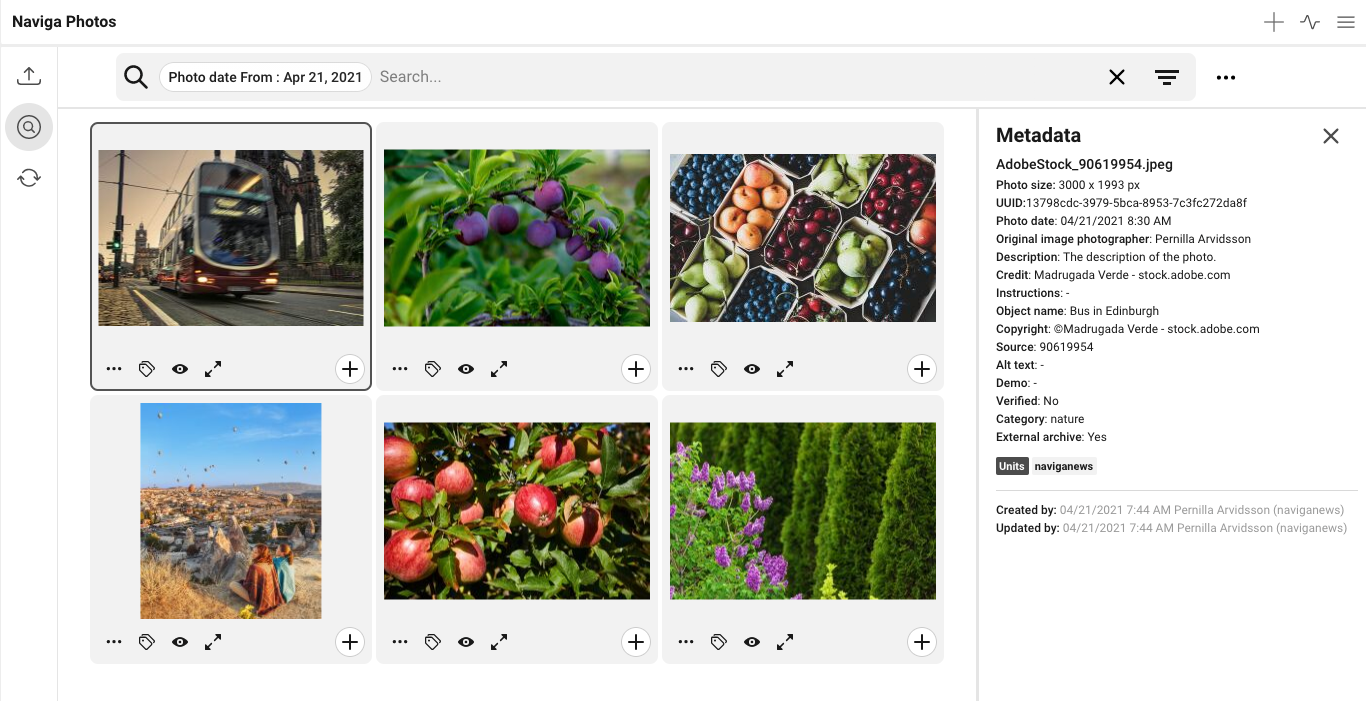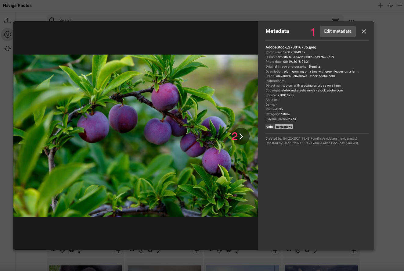If you click on the eye-icon, or press P, a medium-sized large preview of the photo will be opened. You can choose to open edit metadata for the photo by clicking on the button Edit metadata (1), or press cmd+e. You can click on the arrow icon (2), or press the arrows on the key board, to go move within the list.