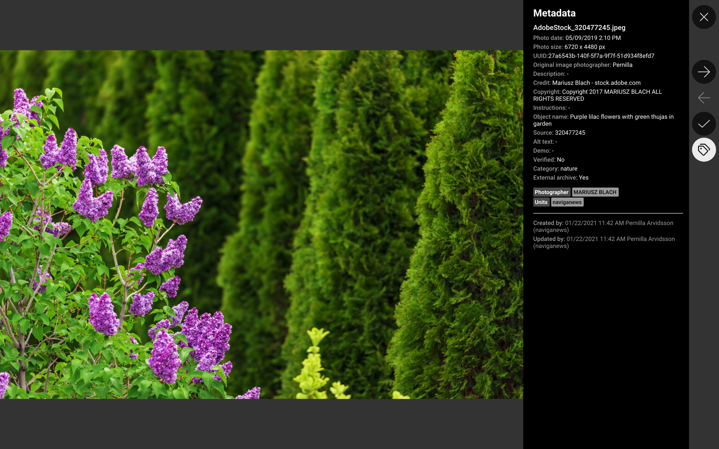 If you click on the eye-icon, or press P, a medium-sized large preview of the photo will be opened. You can choose to open edit metadata for the photo by clicking on the button Edit metadata (1), or press cmd+e. You can click on the arrow icon (2), or press the arrows on the key board, to go move within the list.