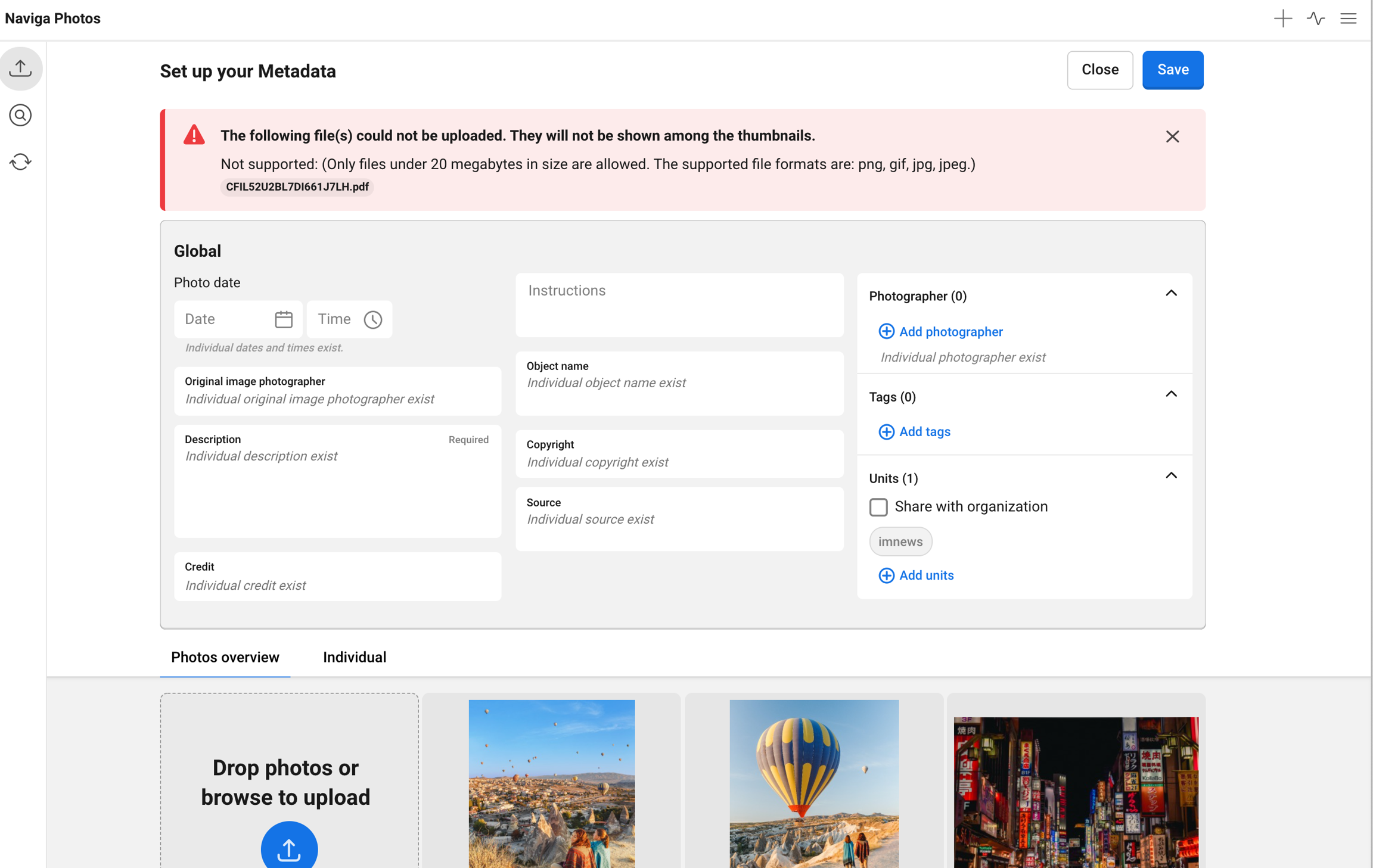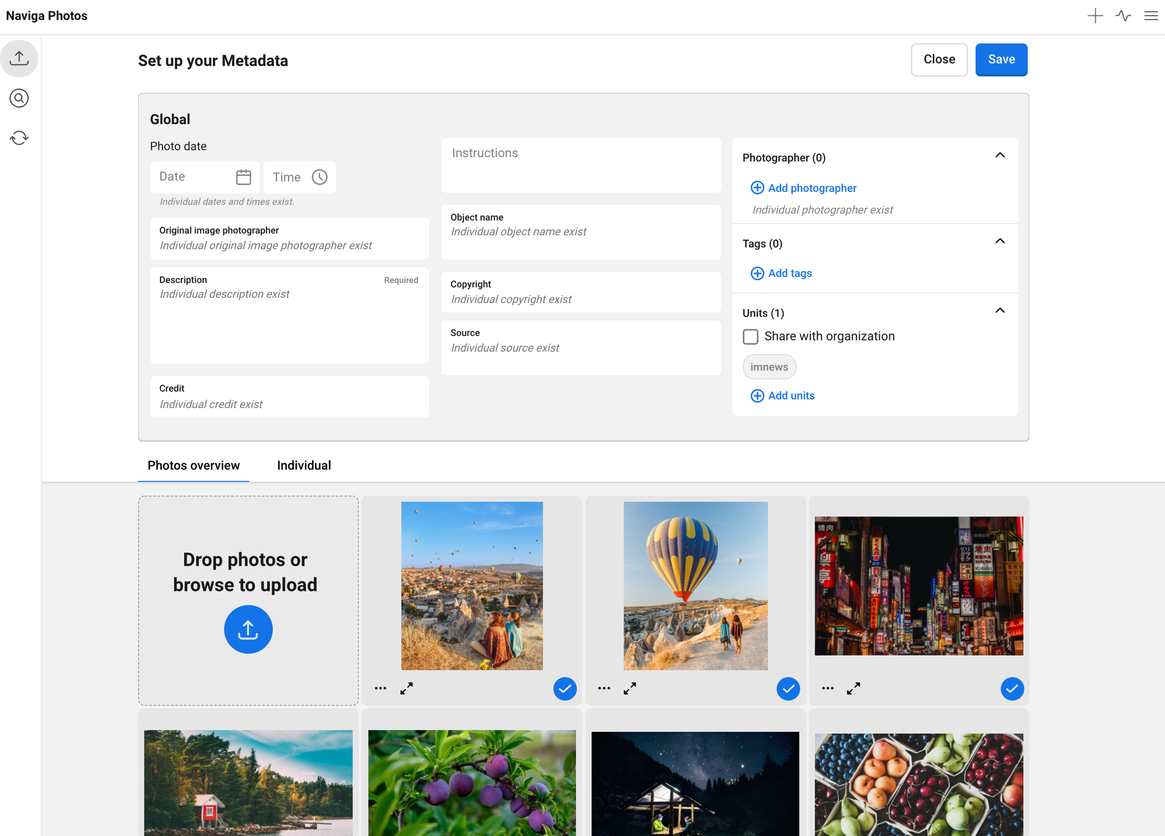 As soon as you have made one of the choices you will see all your photos in a list, with global metadata settings above. You can see them as thumbnails in the tab Photos overview or in a more detailed view in the tab Individual. This will be explained later in this manual. In top of the tab Photos overview, to the left of the first thumbnail, you have the possibility to choose to add more photos by browsing or drag and drop.