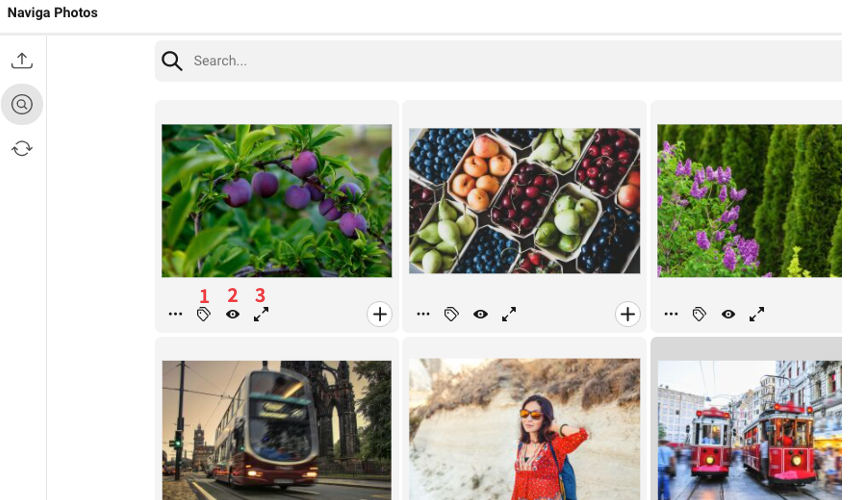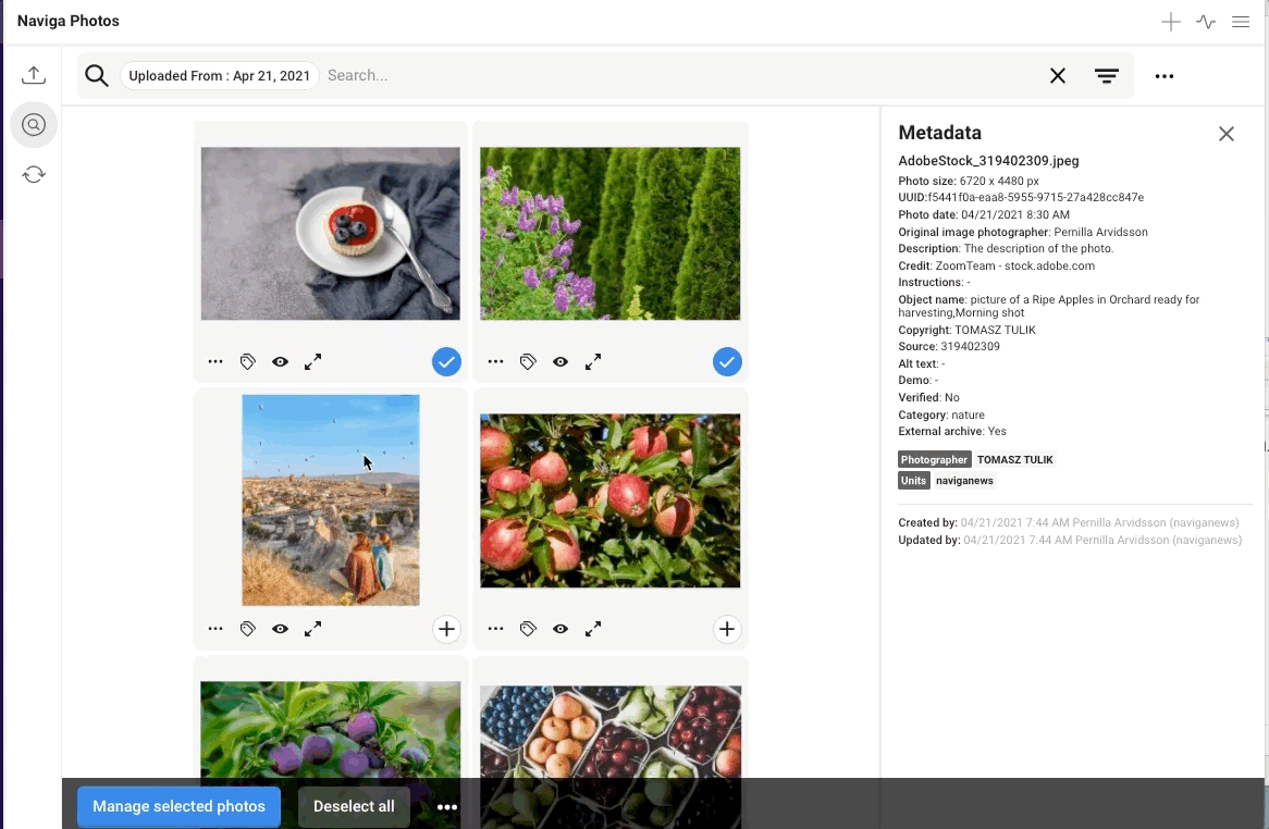 If you click on the eye-icon, or press P, a medium-sized large preview of the photo will be opened. You can choose to open edit metadata for the photo by clicking on the button Edit metadata (1), or press cmd+e. You can click on the arrow icon (2), or press the arrows on the key board, to go move within the list.